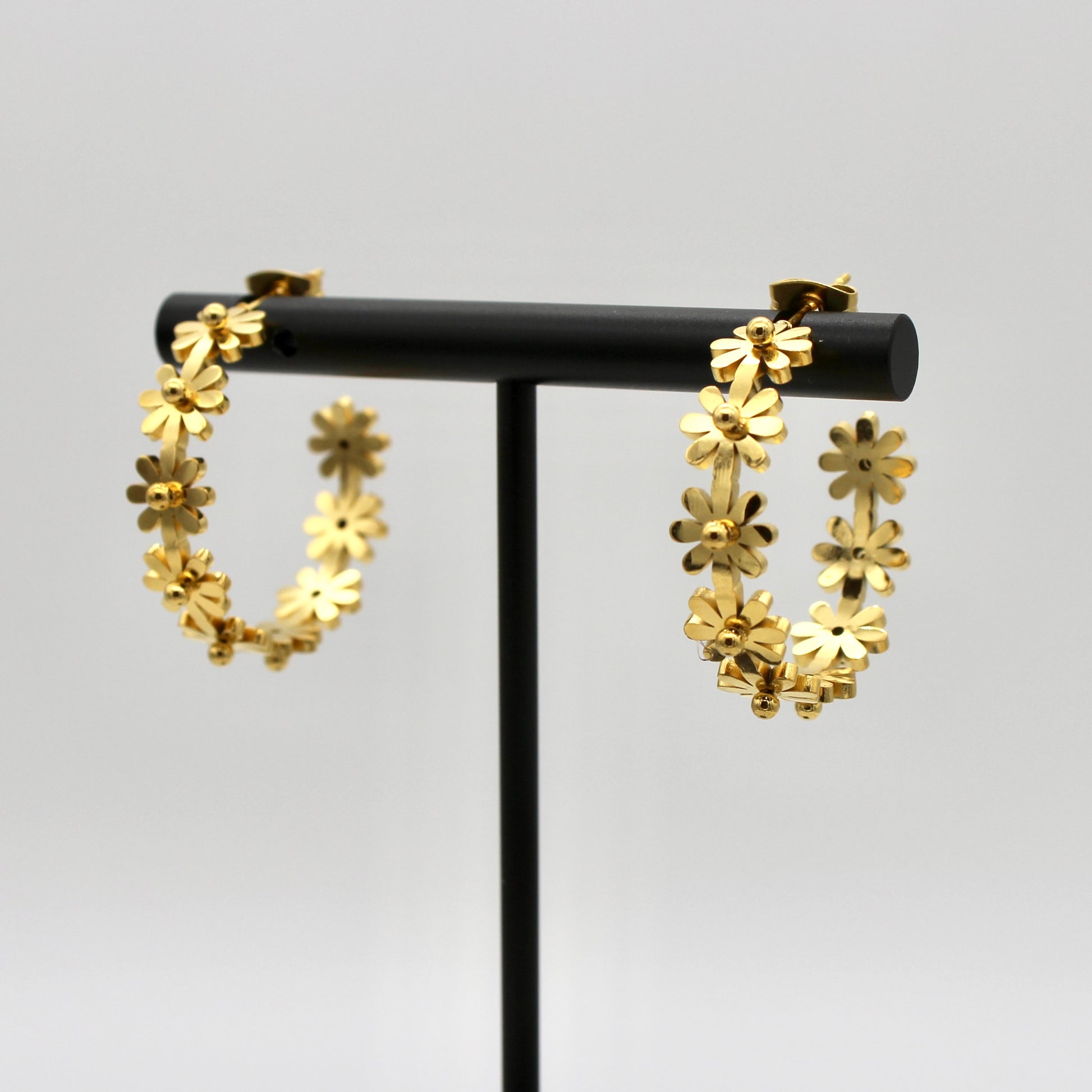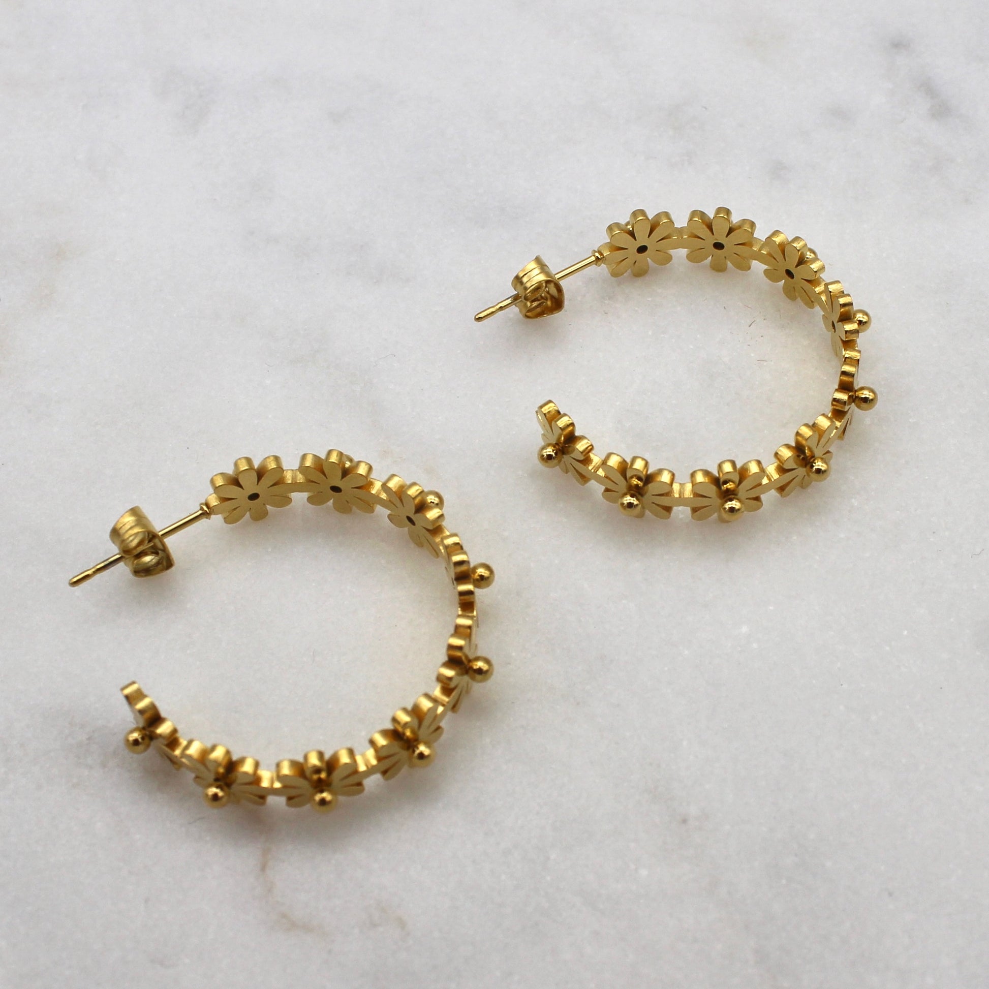 Pair of mid-size hoops with metal daisy-shaped chain detailing. Made from stainless steel with gold plating.
