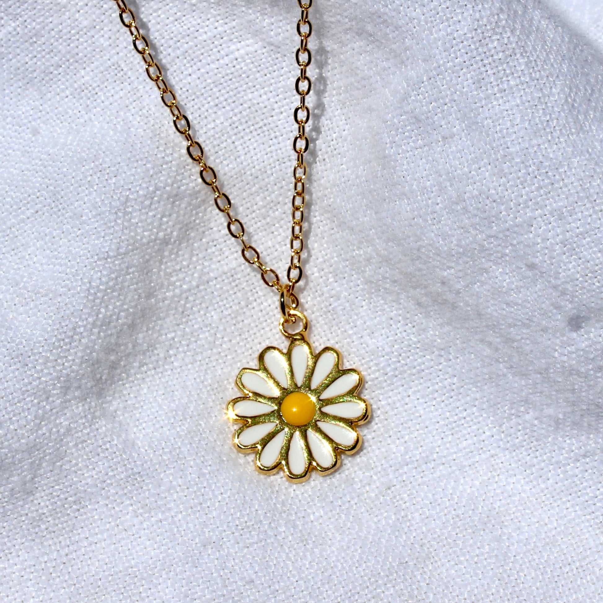 This necklace features an enamel 14x17mm daisy charm attached to a 16" chain.