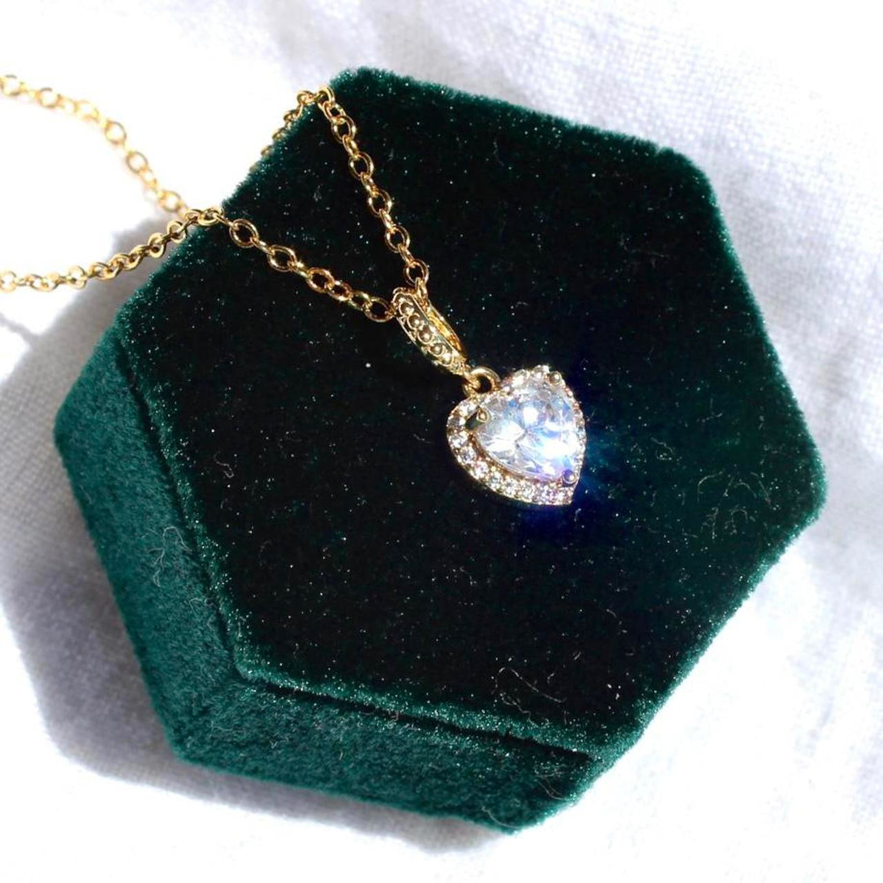 This pendant necklace features a 24k gold plated chain with a sparkly heart pendant.