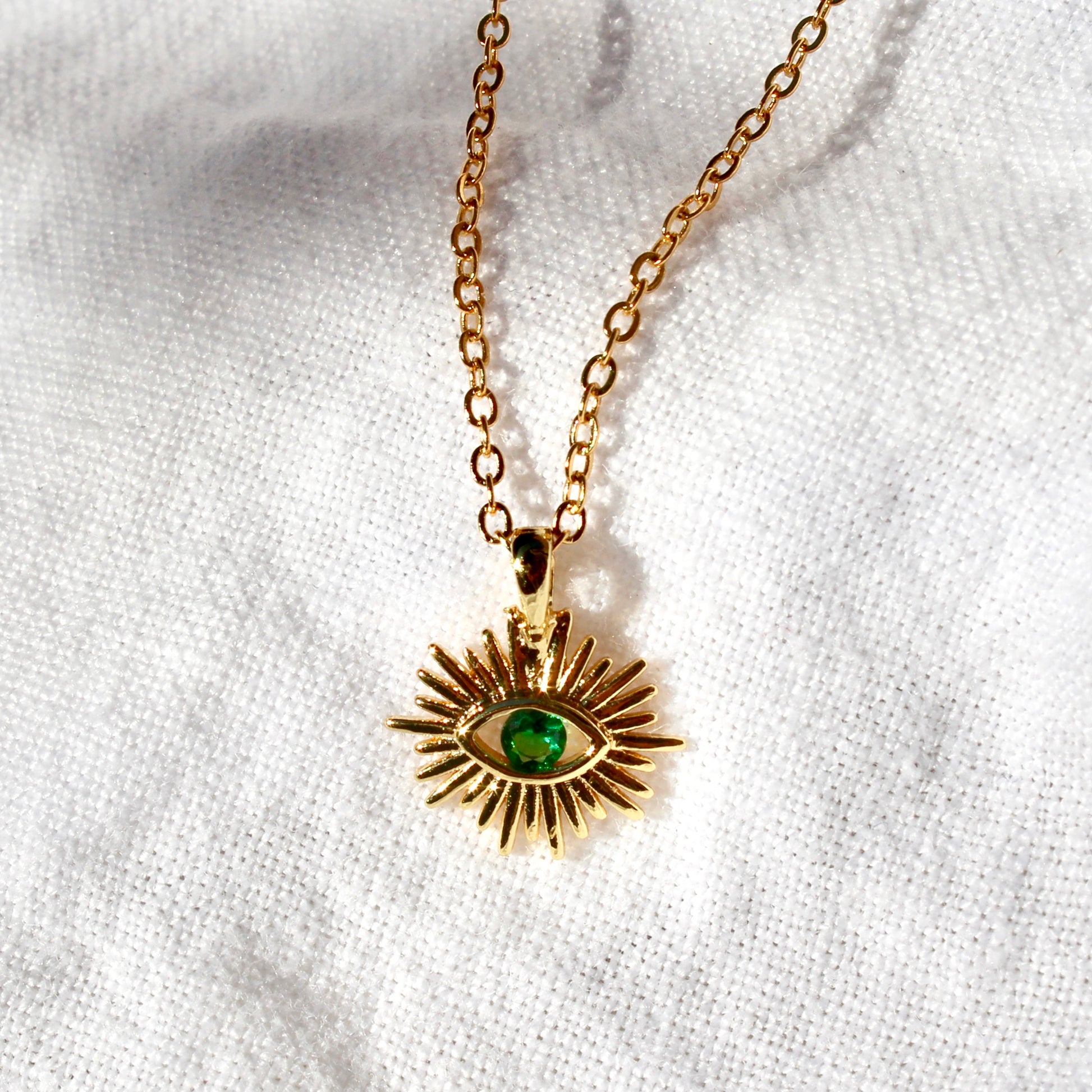 This necklace features an 14mm evil eye charm with a faux emerald center stone attached to a 16" chain.