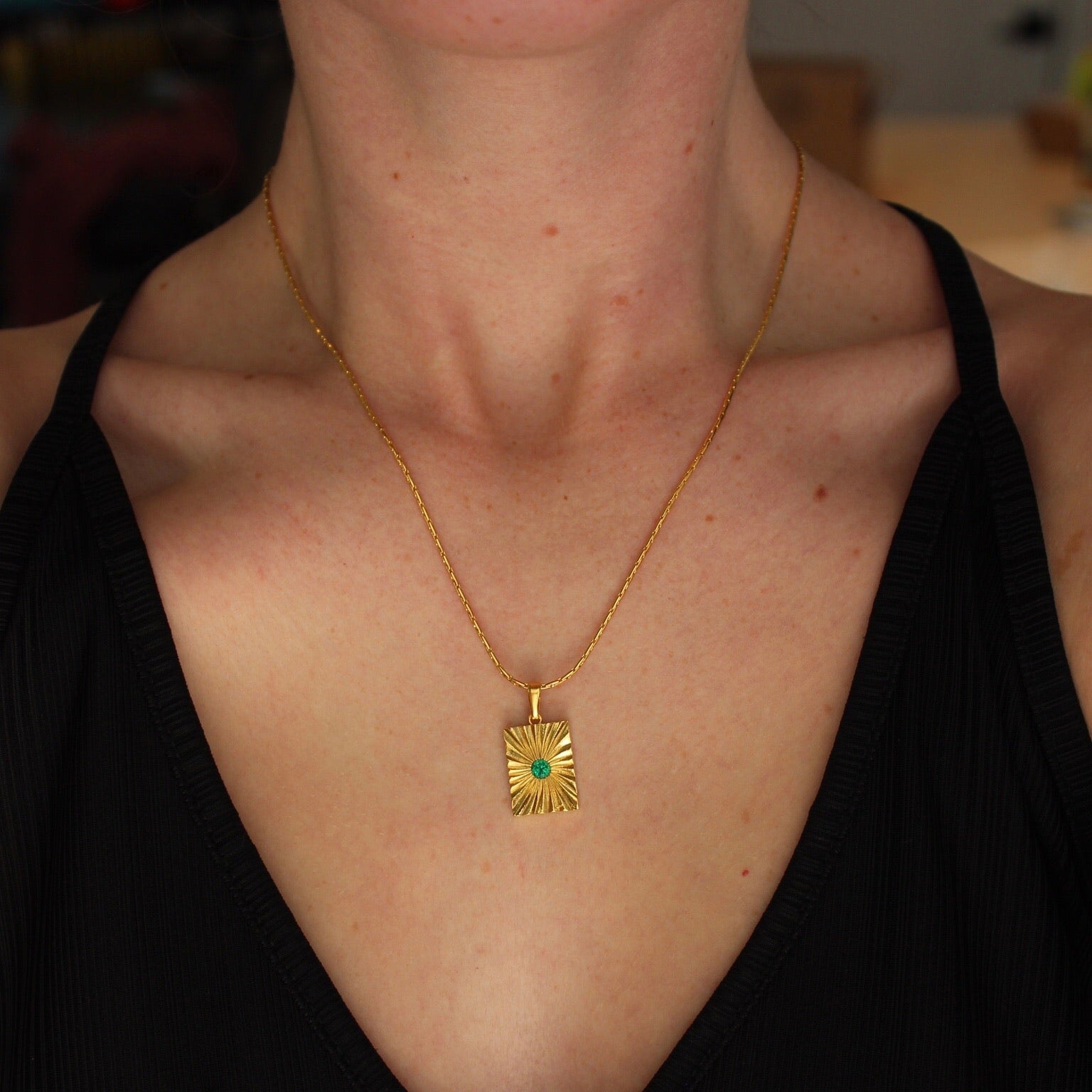 This necklace is such a fun statement piece that is not too overwhelming. Gorgeous dainty chain and sparkly emerald stone in the pendant makes for a beautiful look.