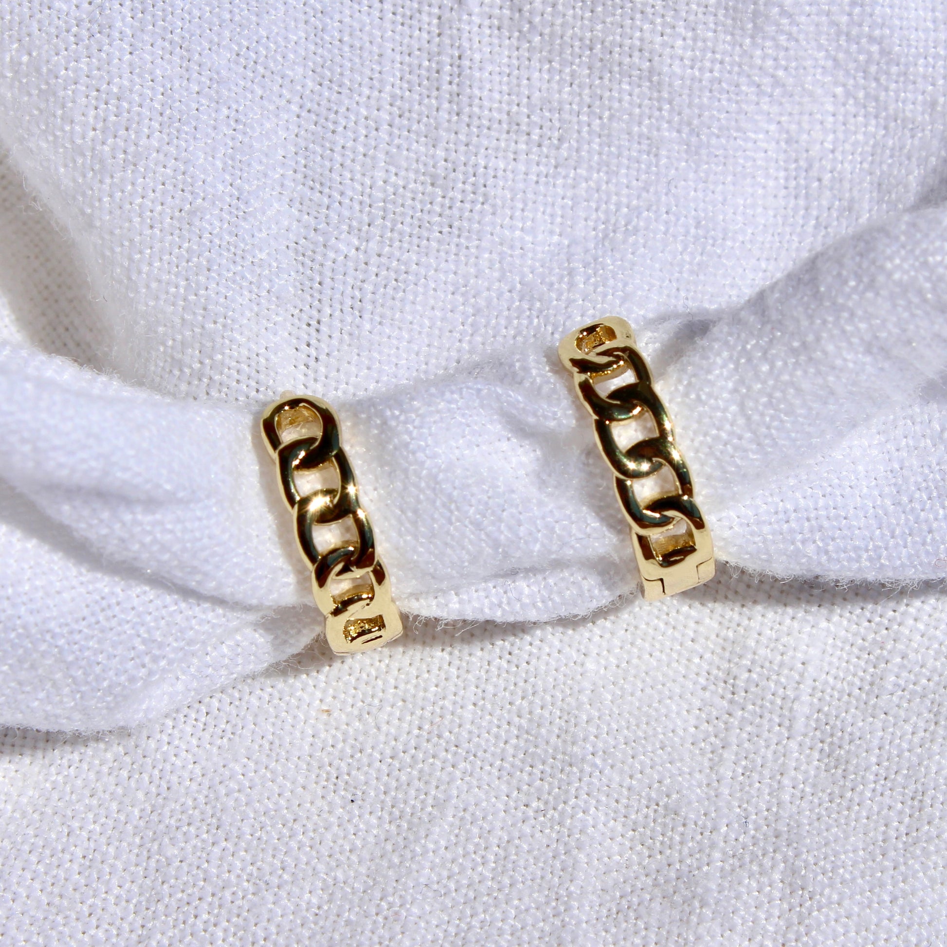 15mm chain link hoops made in 14k gold filled brass material. Click to close style make these hoops extremely comfortable to wear and sleep in.