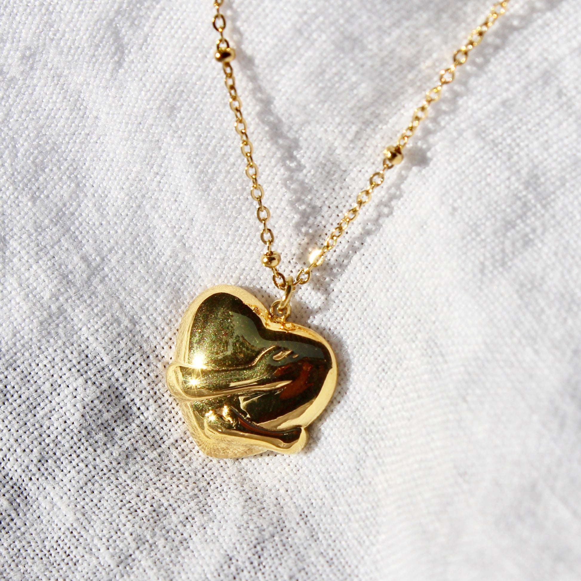 This necklace features a beaded cable chain with a weighty heart pendant that features the impression of an hug. The arms embrace the heart as if hugging.