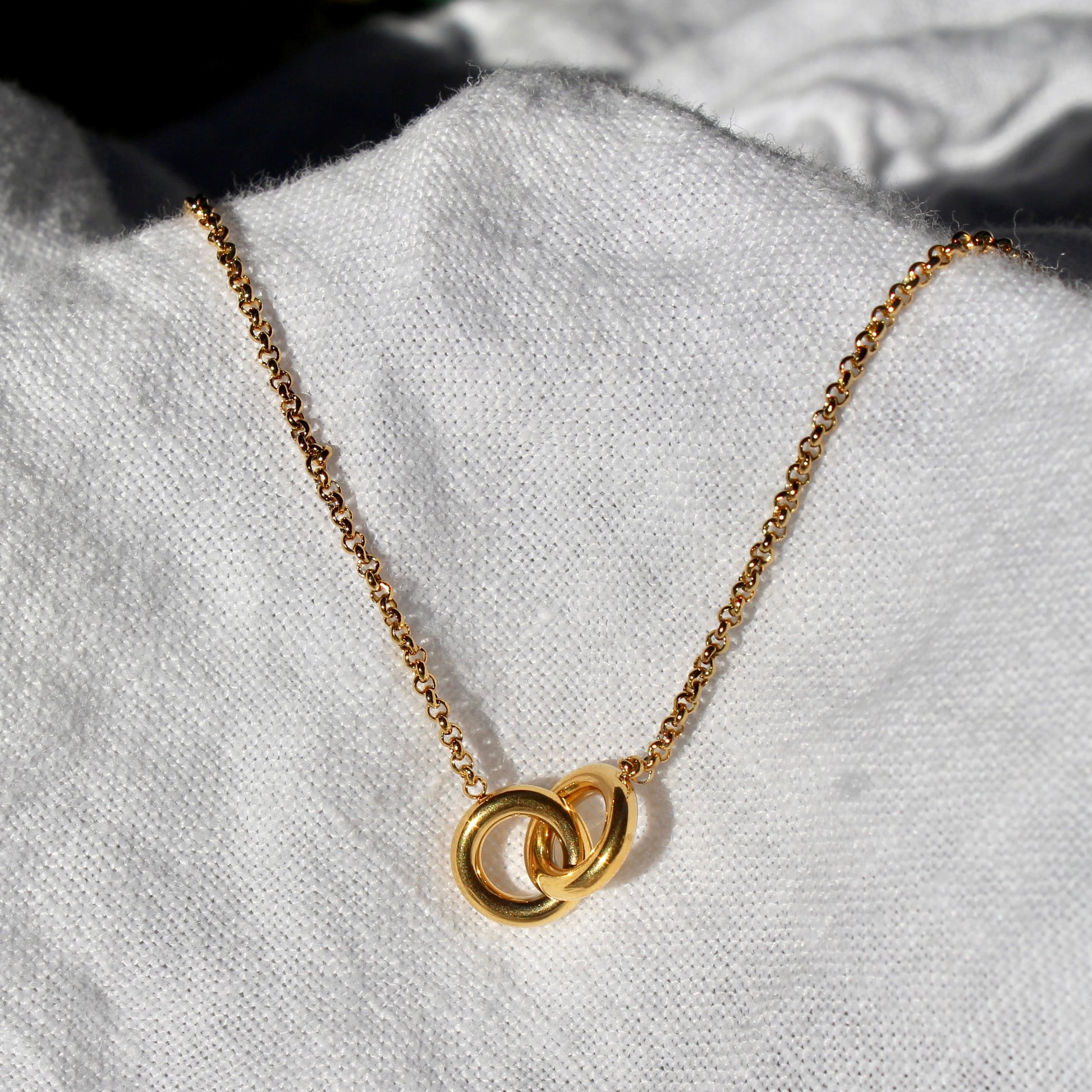 This gold necklace features two linked hoops, a modern and stylish design that's perfect for any occasion.