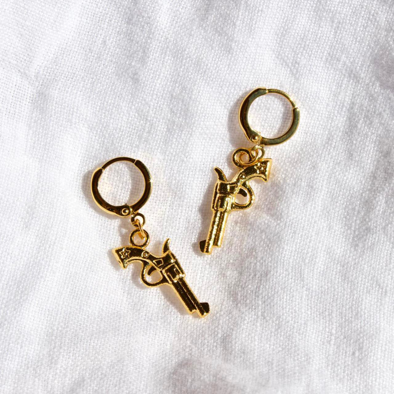 24k gold plated little revolver charms attached to mini hoops. All components are tarnish resistant.