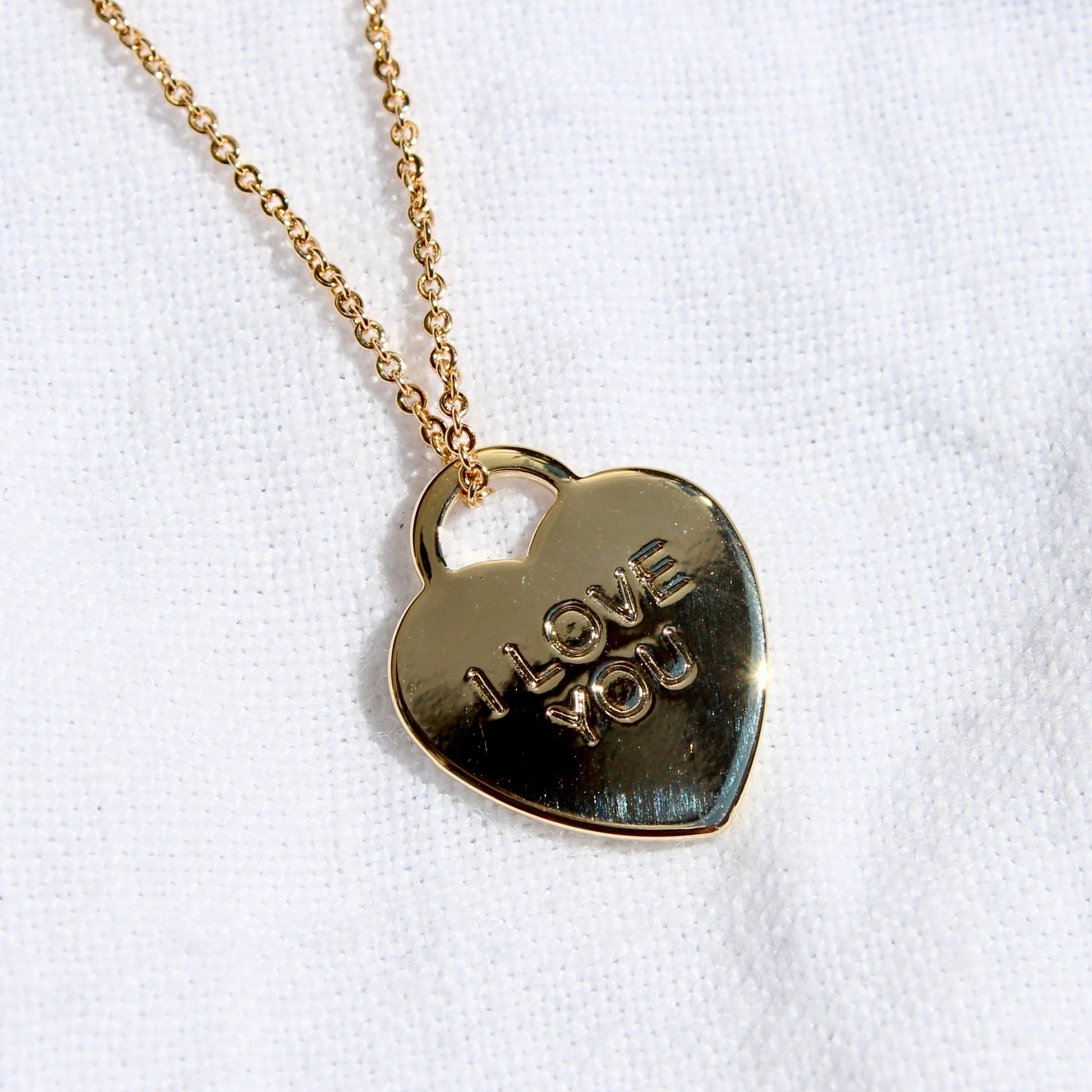 This necklace features a 21x27mm polished gold heart charm with the words "I Love You" embossed on the front which has been threaded on a dainty chain.