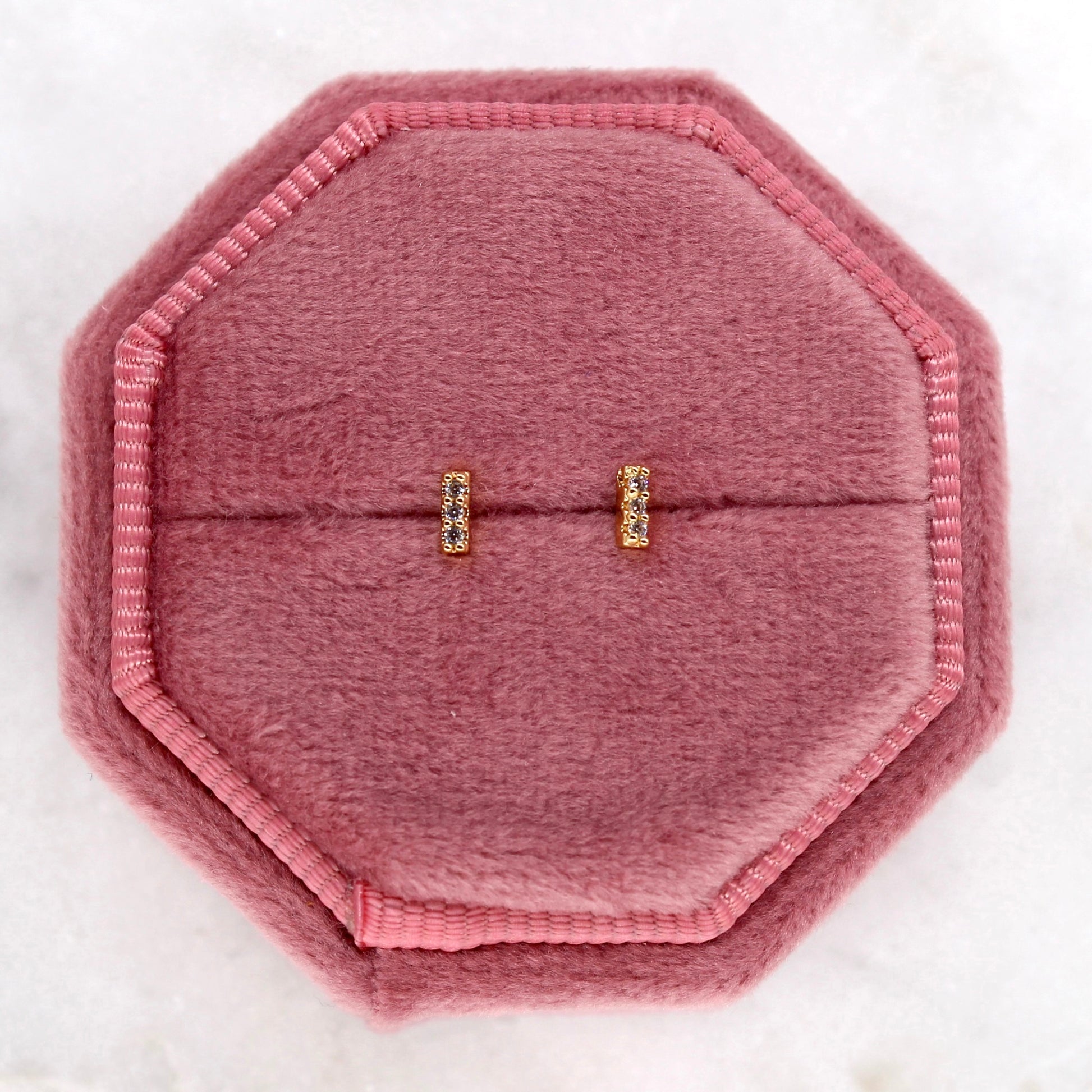 These stud earrings feature a dainty row of three pave cubic zirconia stones and make the perfect addition to any ear stack. Made of 18k gold plated material, these earrings are tarnish resistant.