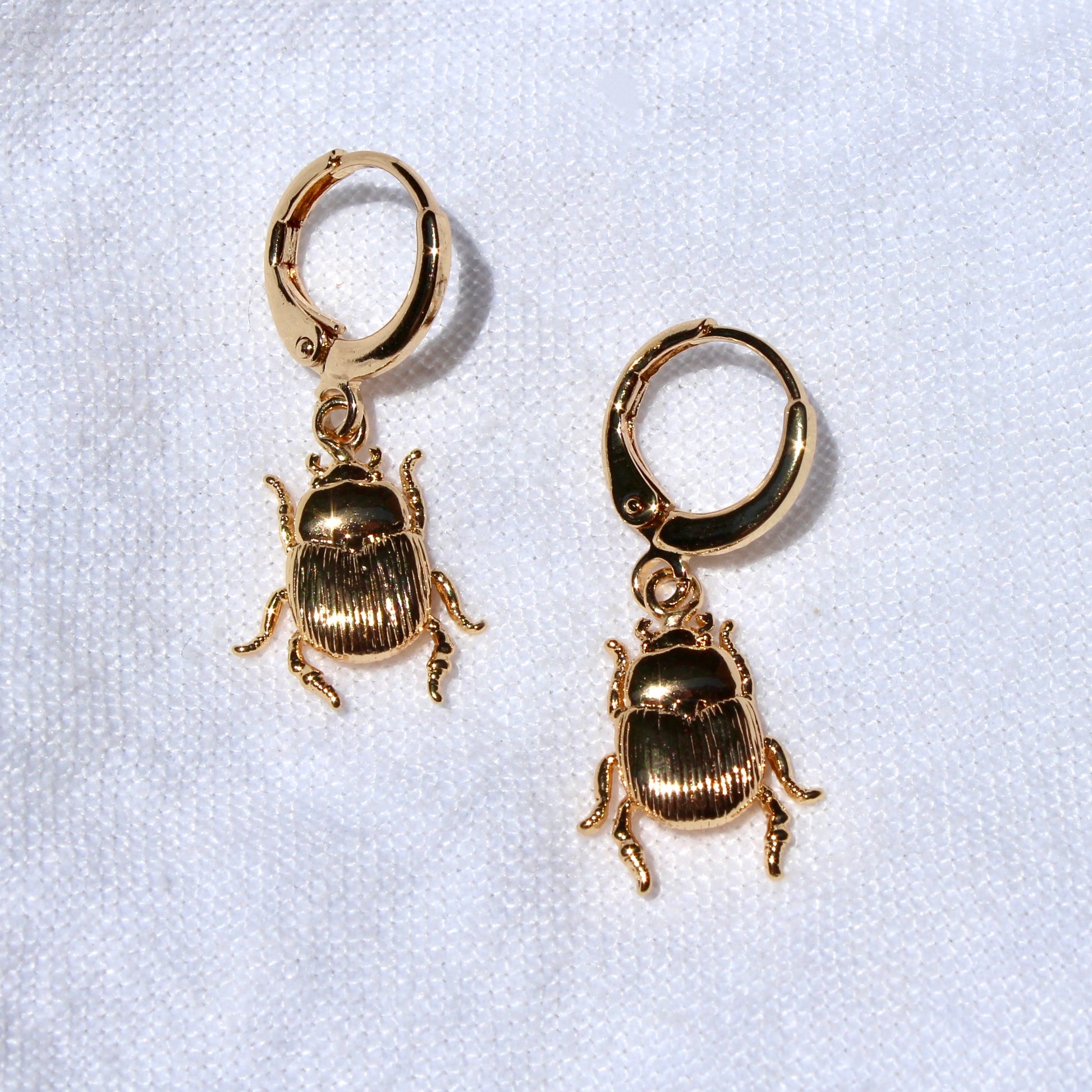These cute little hoops feature a 10x13mm beetle charm on an 11mm hoop. All materials are 18k gold plated and tarnish resistant.