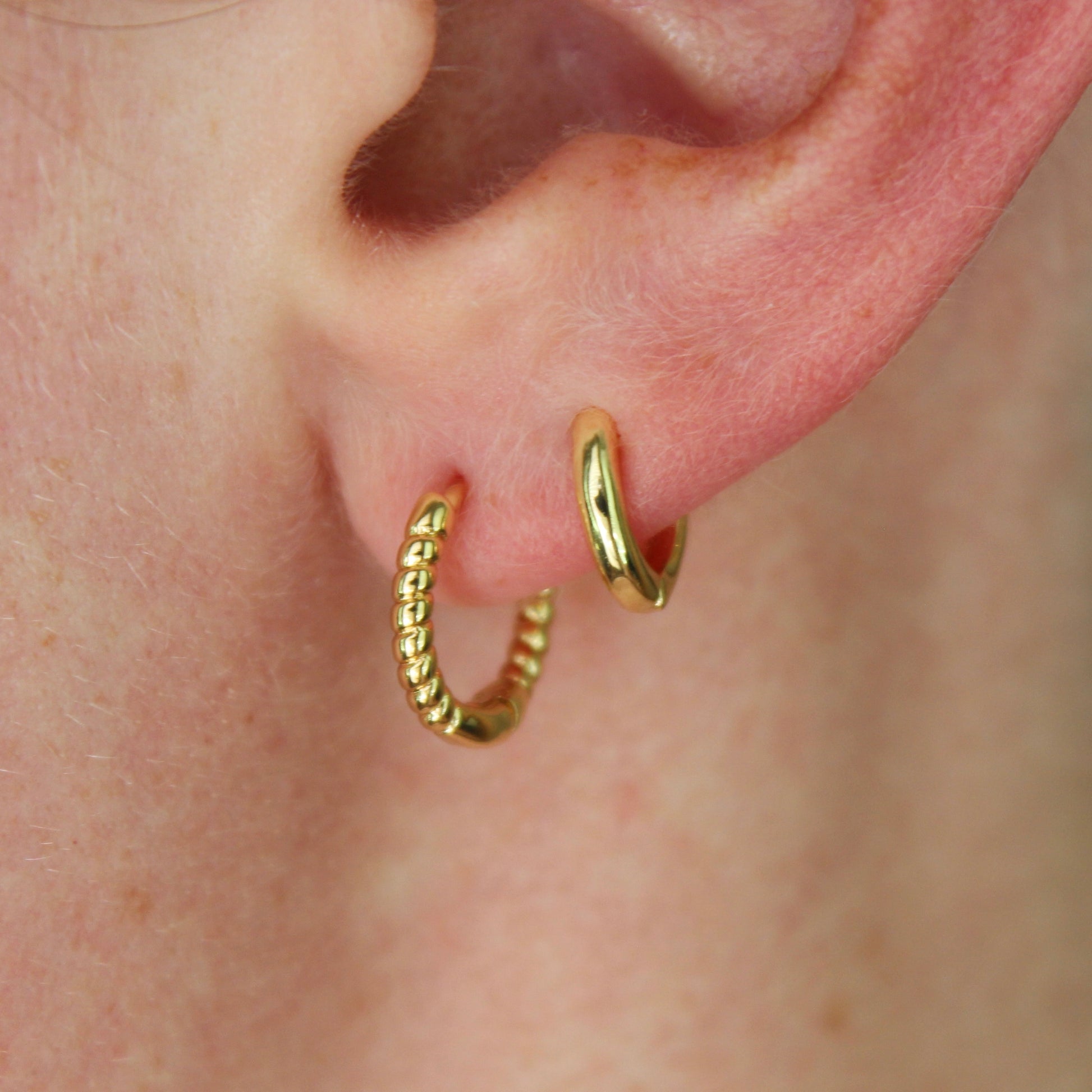 These minimal little hoops feature twist detailing for an added level of fun. Gold plated copper, lead and nickel free.