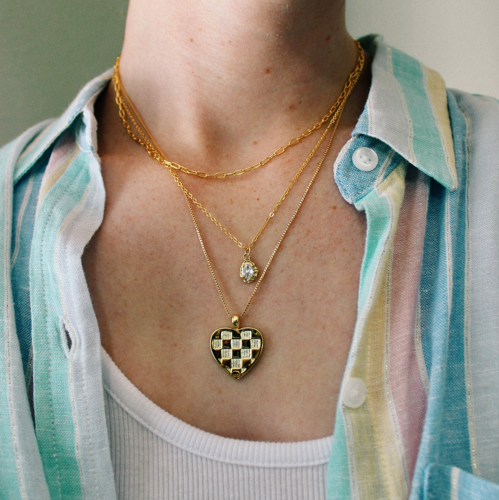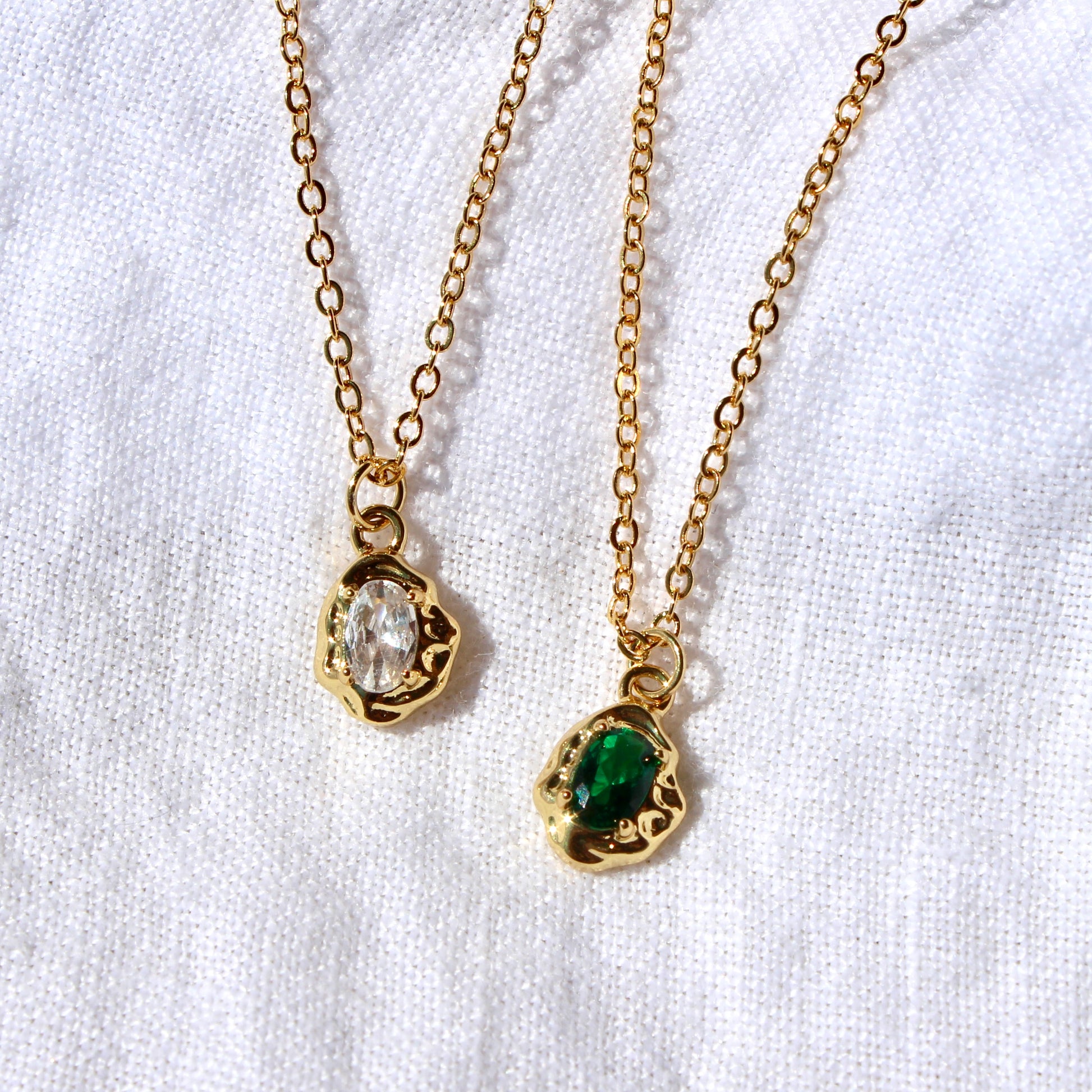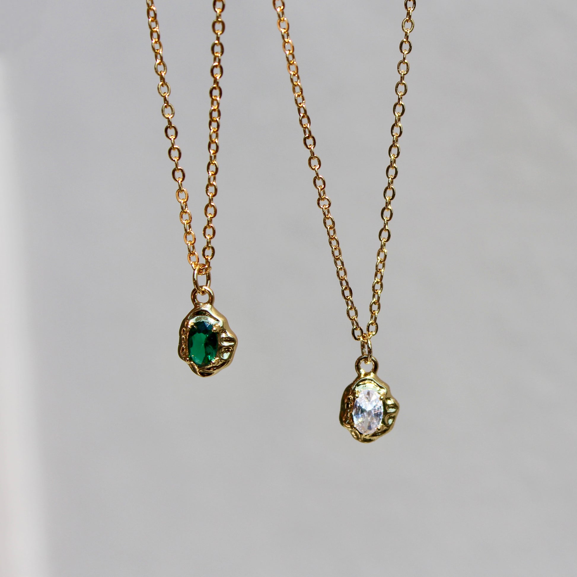 This 24k gold plated necklace features a little pendant with an emerald green or clear stone set in the center.