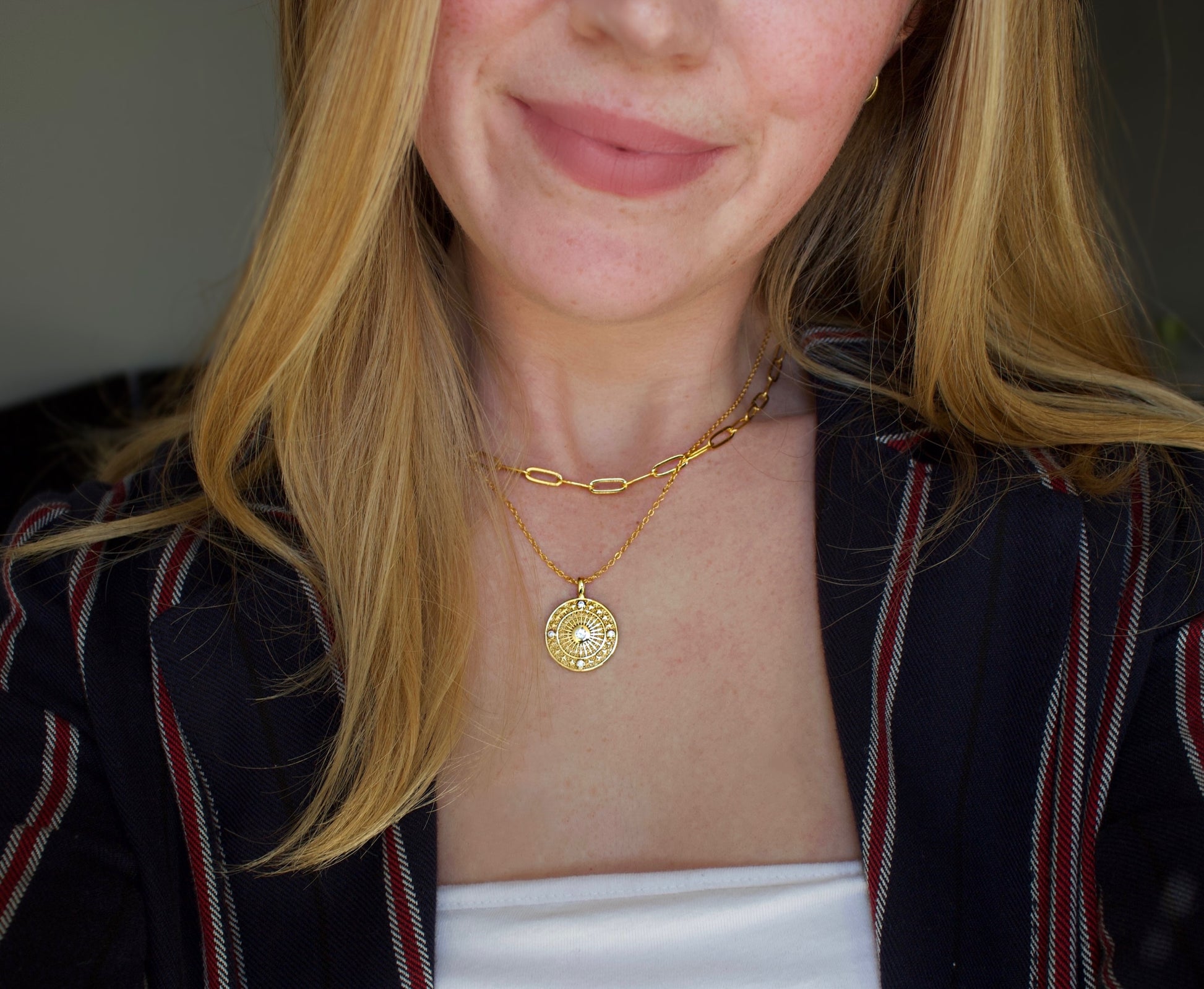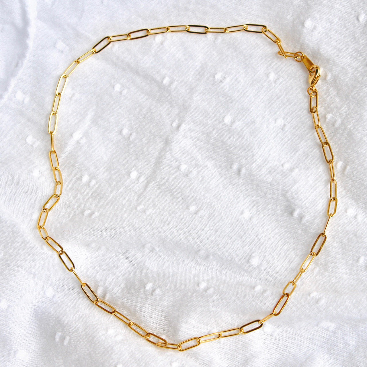 This classic necklace is composed of 24k gold plated paperclip style chain with links measuring 4.5x10mm.