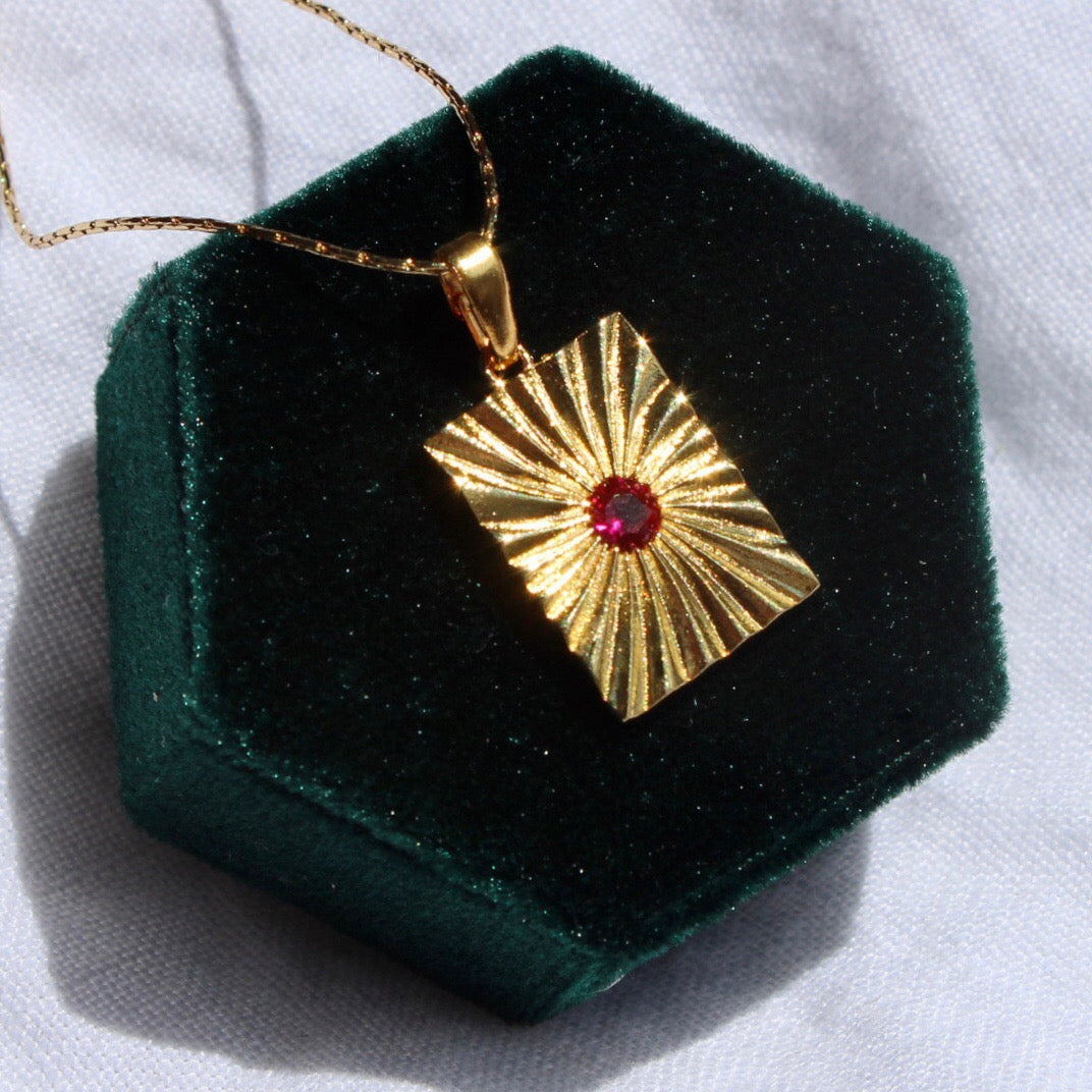 This necklace is such a fun statement piece that is not too overwhelming. Gorgeous dainty chain and sparkly ruby stone in the pendant makes for a beautiful look.