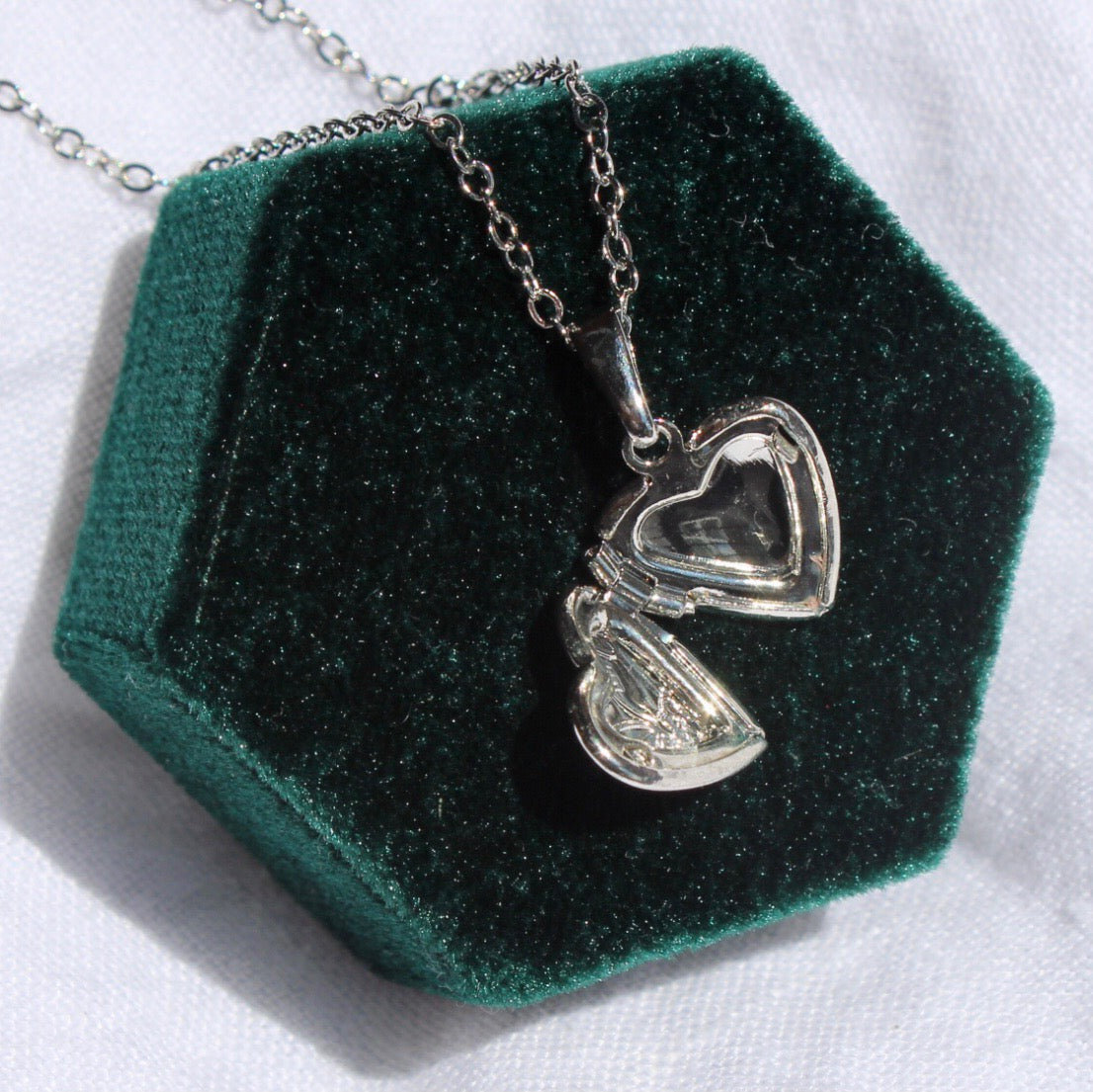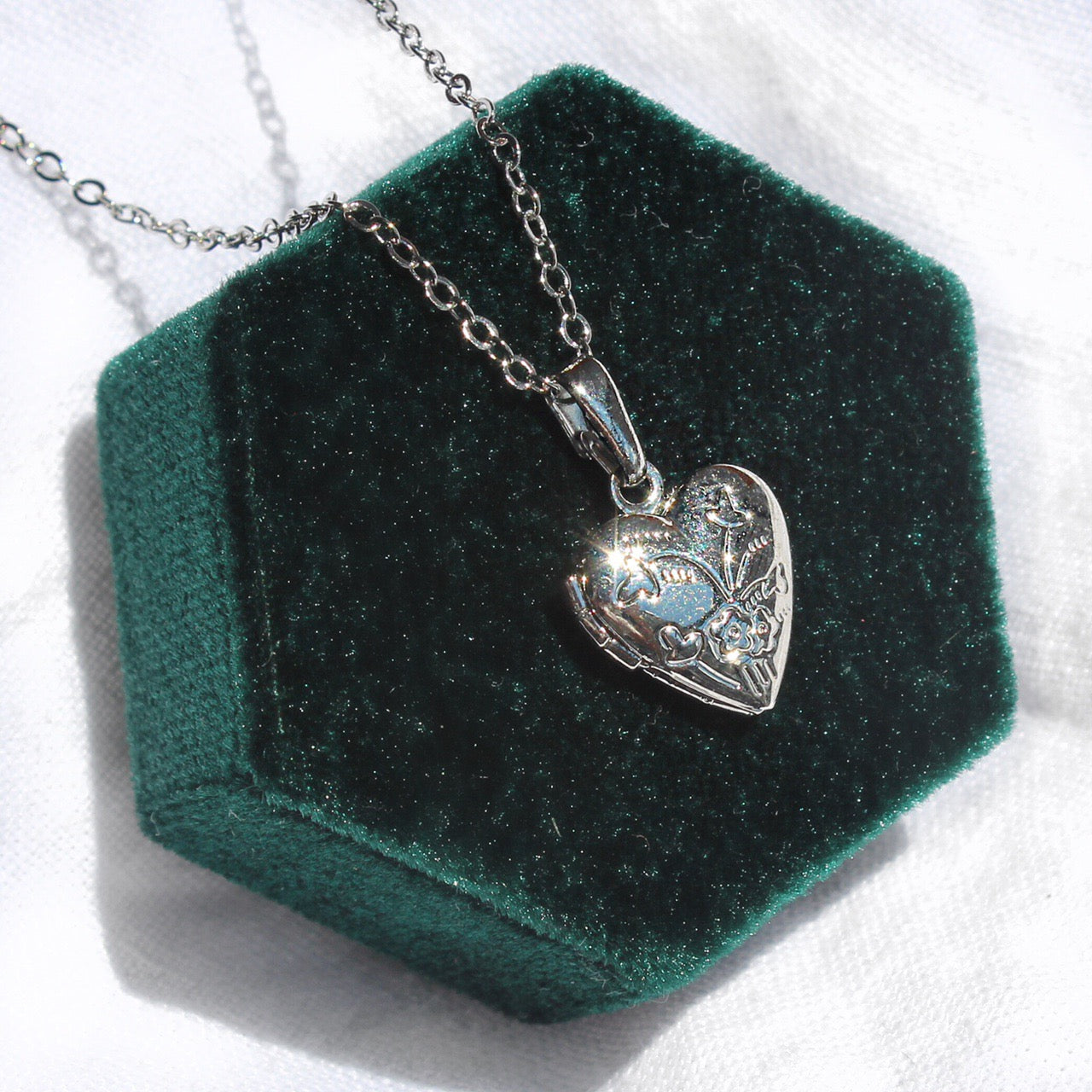 This necklace features a little 13x15mm heart shaped locket pendant with floral detailing on the face. All materials are silver plated and tarnish resistant.