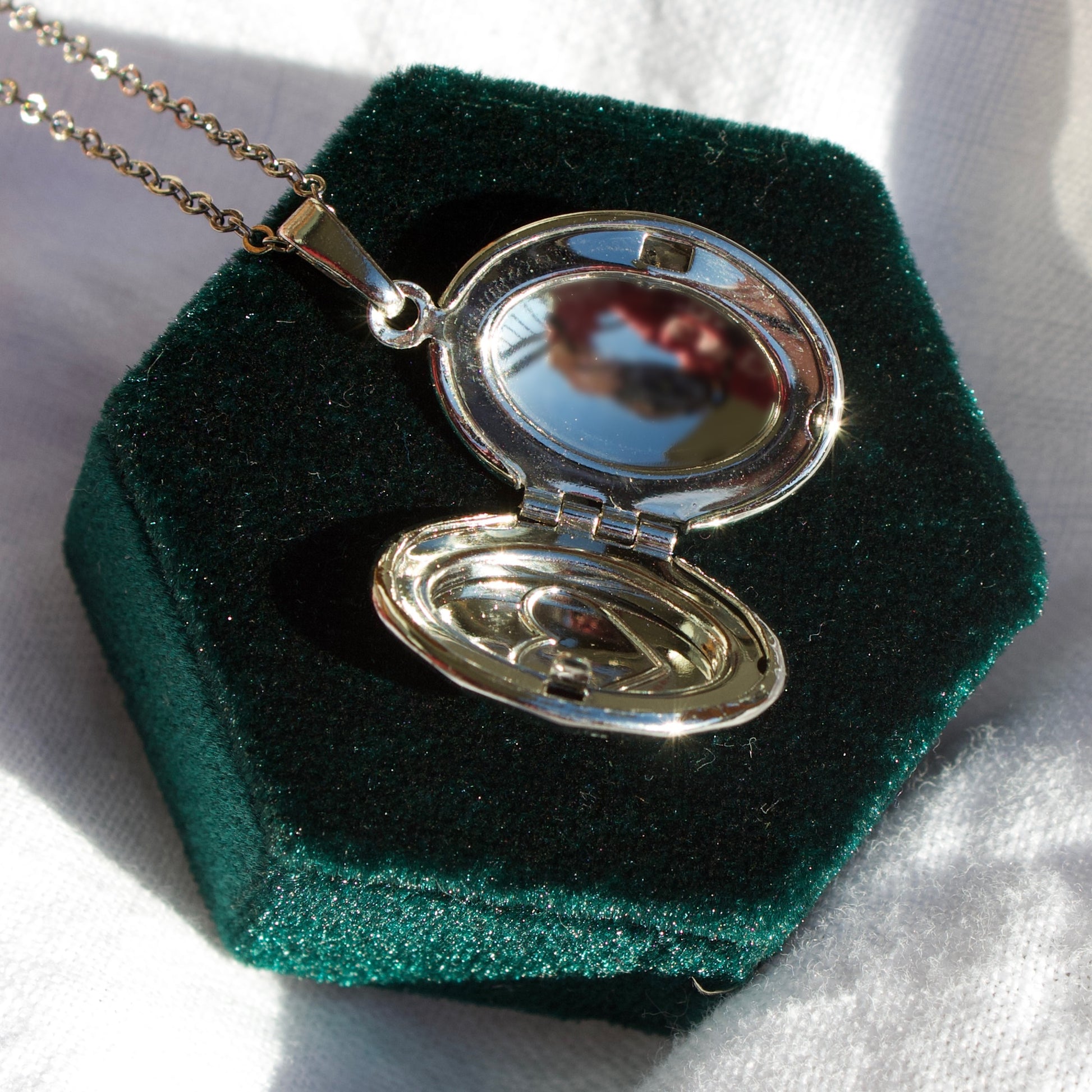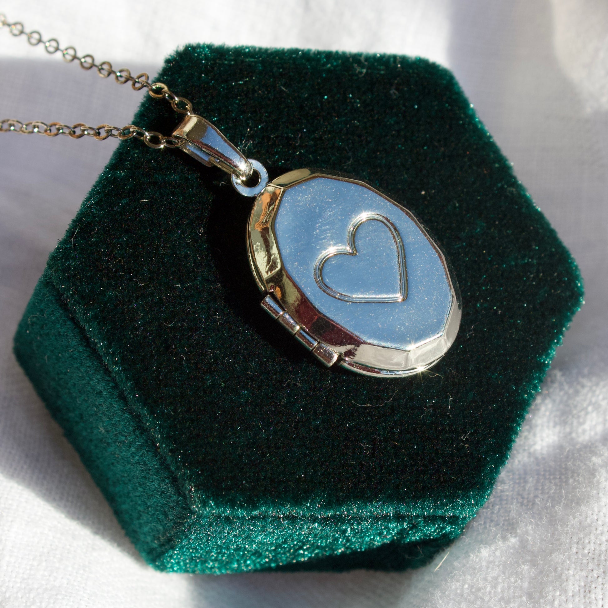 This necklace features an oval locket pendant with an heart impression. All materials are silver plated and tarnish resistant.