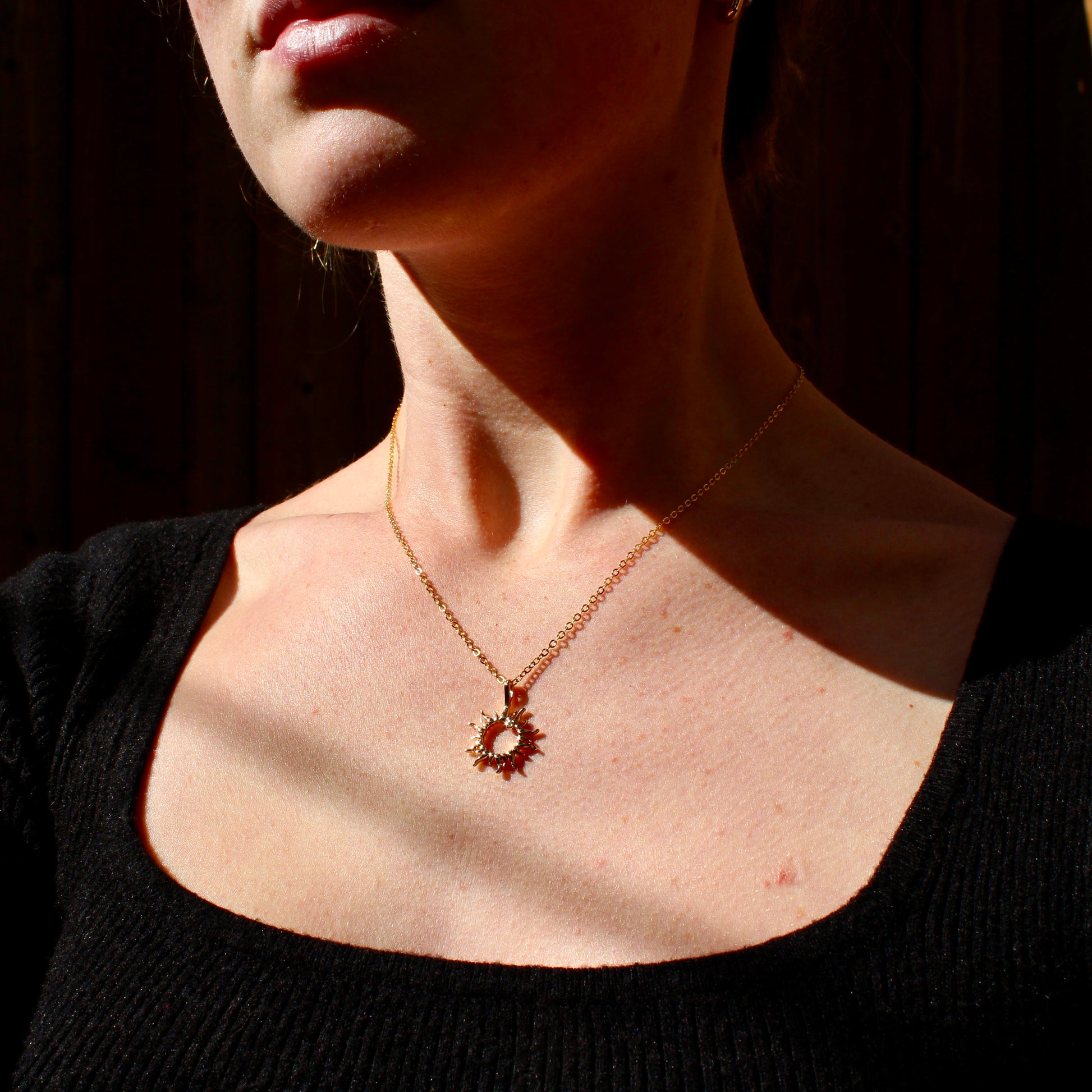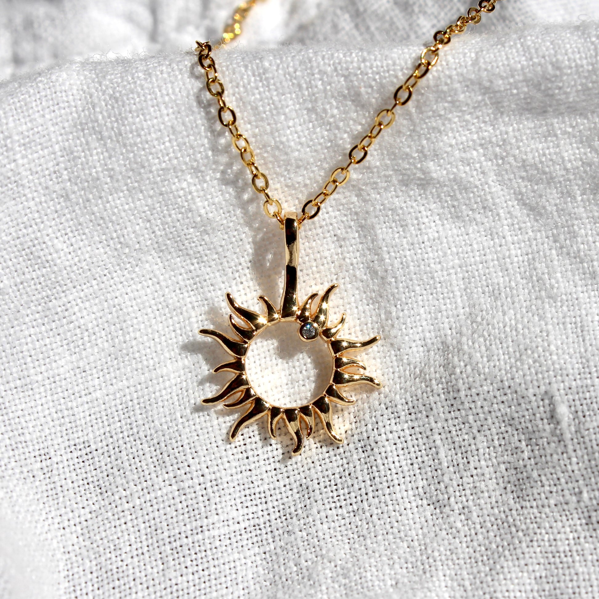 This necklace is composed of a beautiful sun pendant with embedded cubic zirconia stone that sparkles in the sun on a dainty chain.