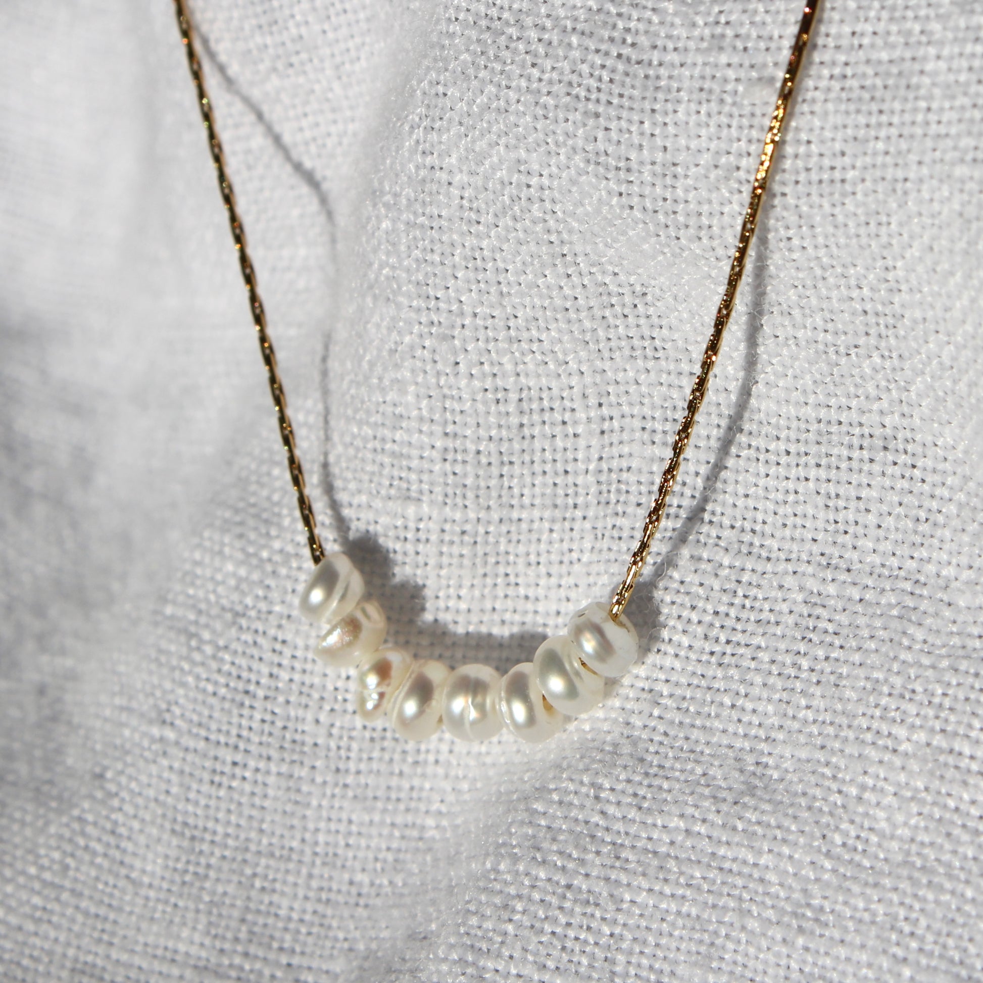 Introducing the perfect piece of jewelry for those who appreciate understated elegance. This dainty minimal pearl necklace features a delicate gold chain and a row of mini threaded pearls that adds a touch of sophistication to any outfit.