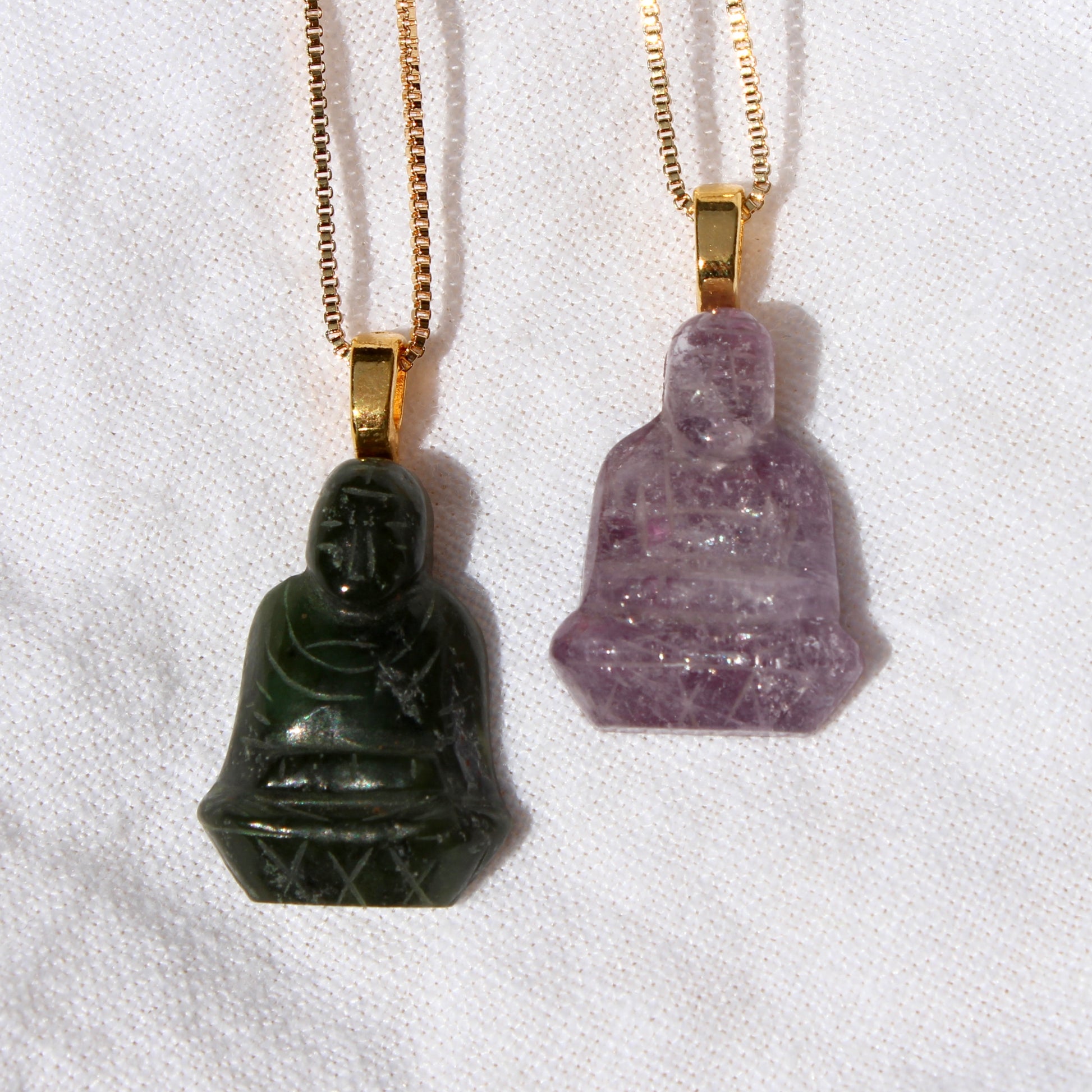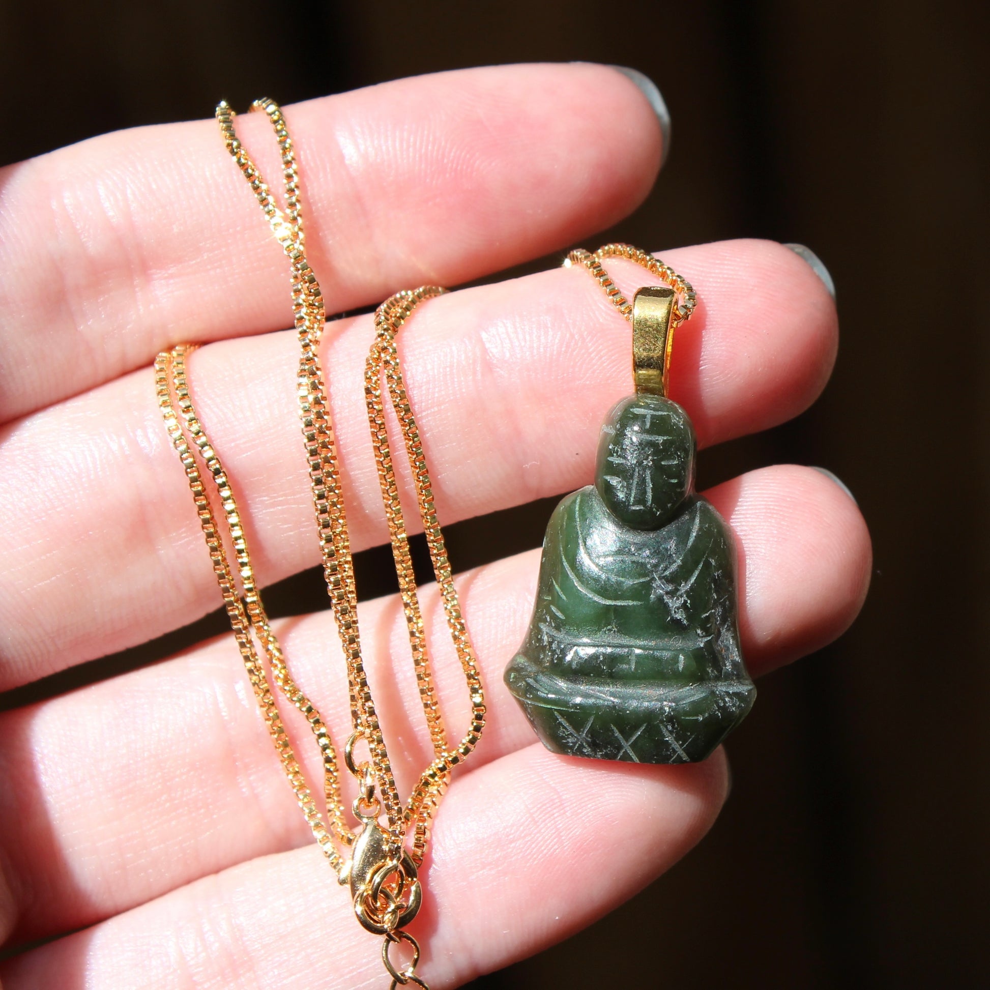 This necklace features a vintage carved buddha stone made circa 1950 for a jewelry brand called "Swank". We sourced these stones from a seller in The Netherlands and have reworked these beautiful stones into a pendant necklace.