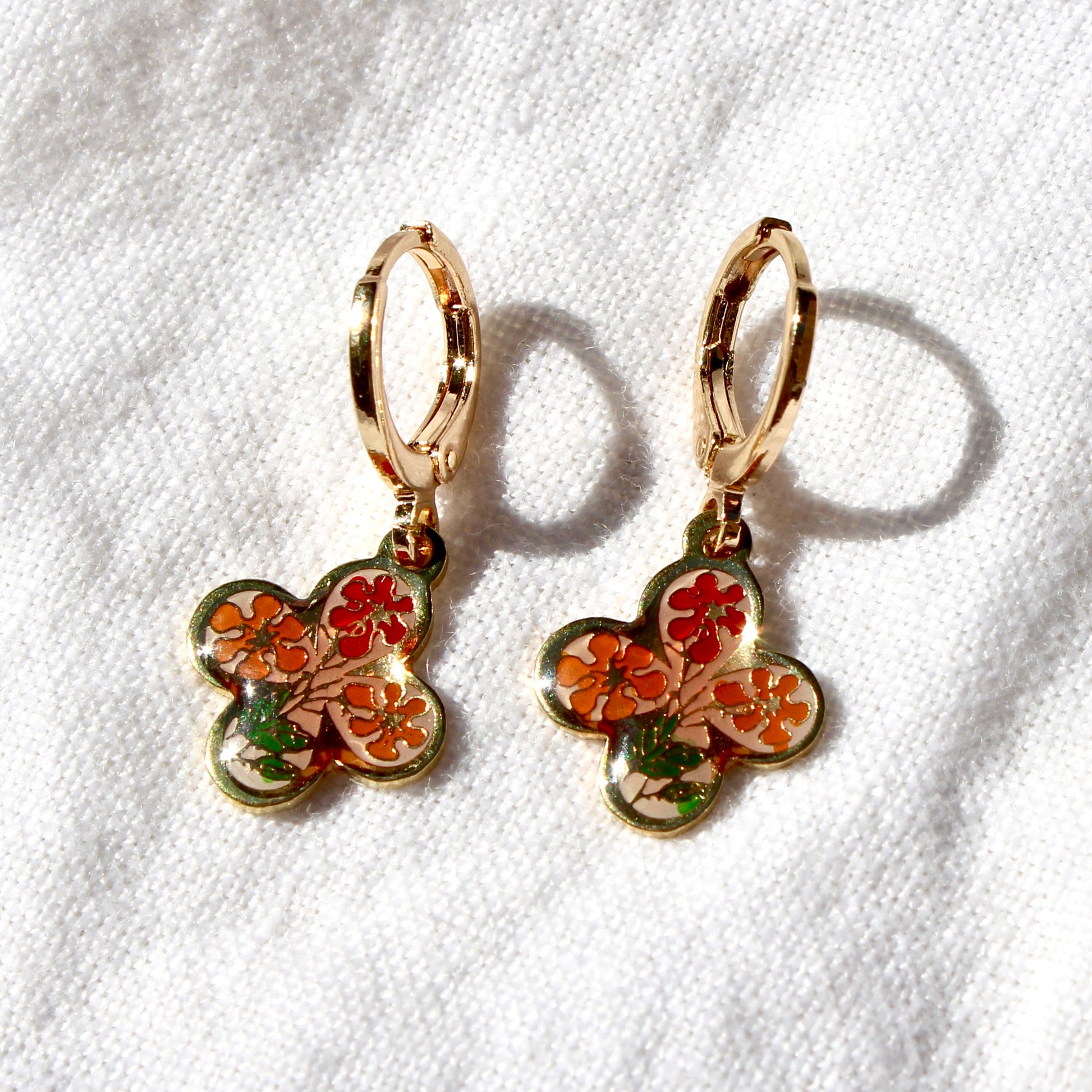 These earrings feature vintage 15mm gold plated and enamel floral charms. The earrings are 18k gold plated copper and are tarnish-resistant.