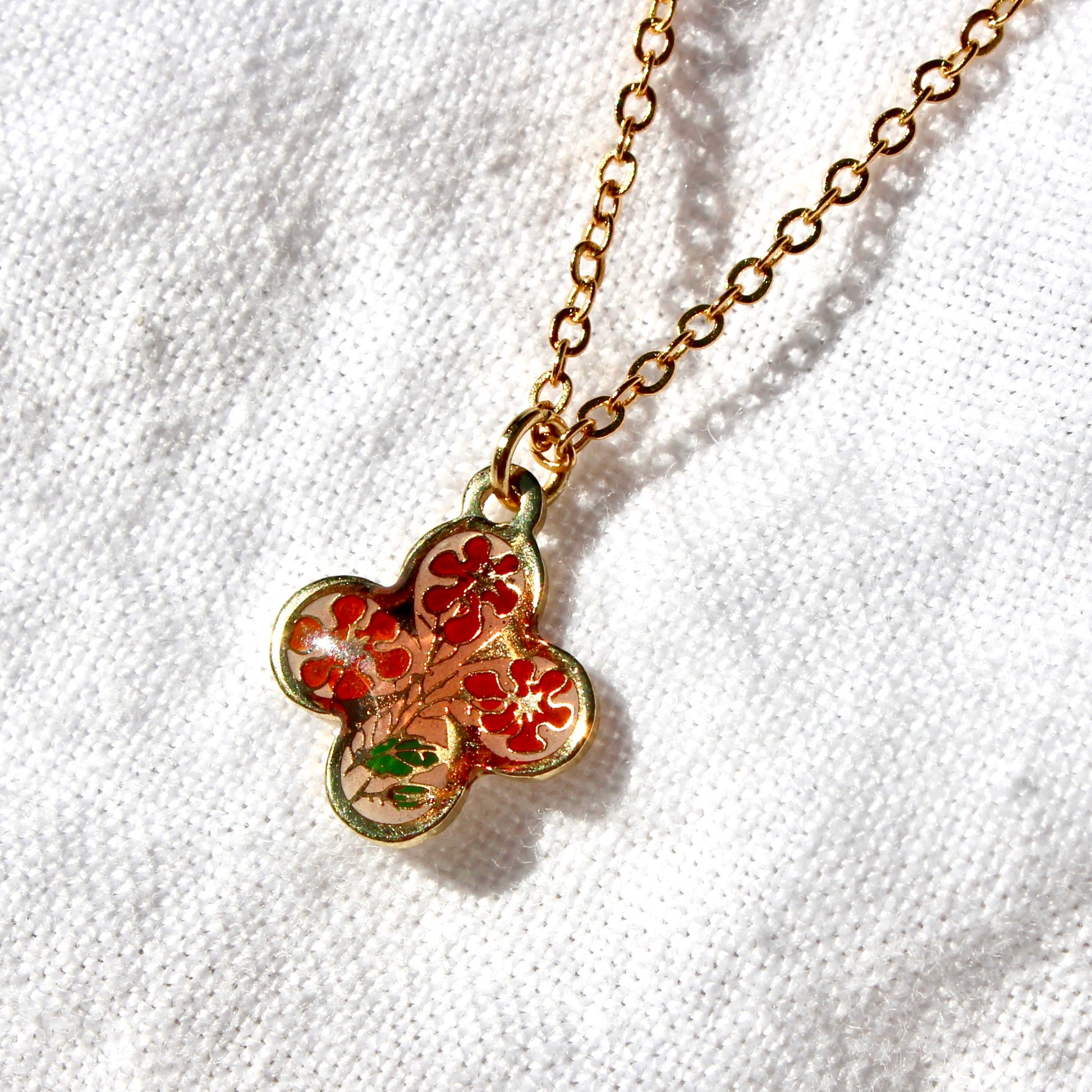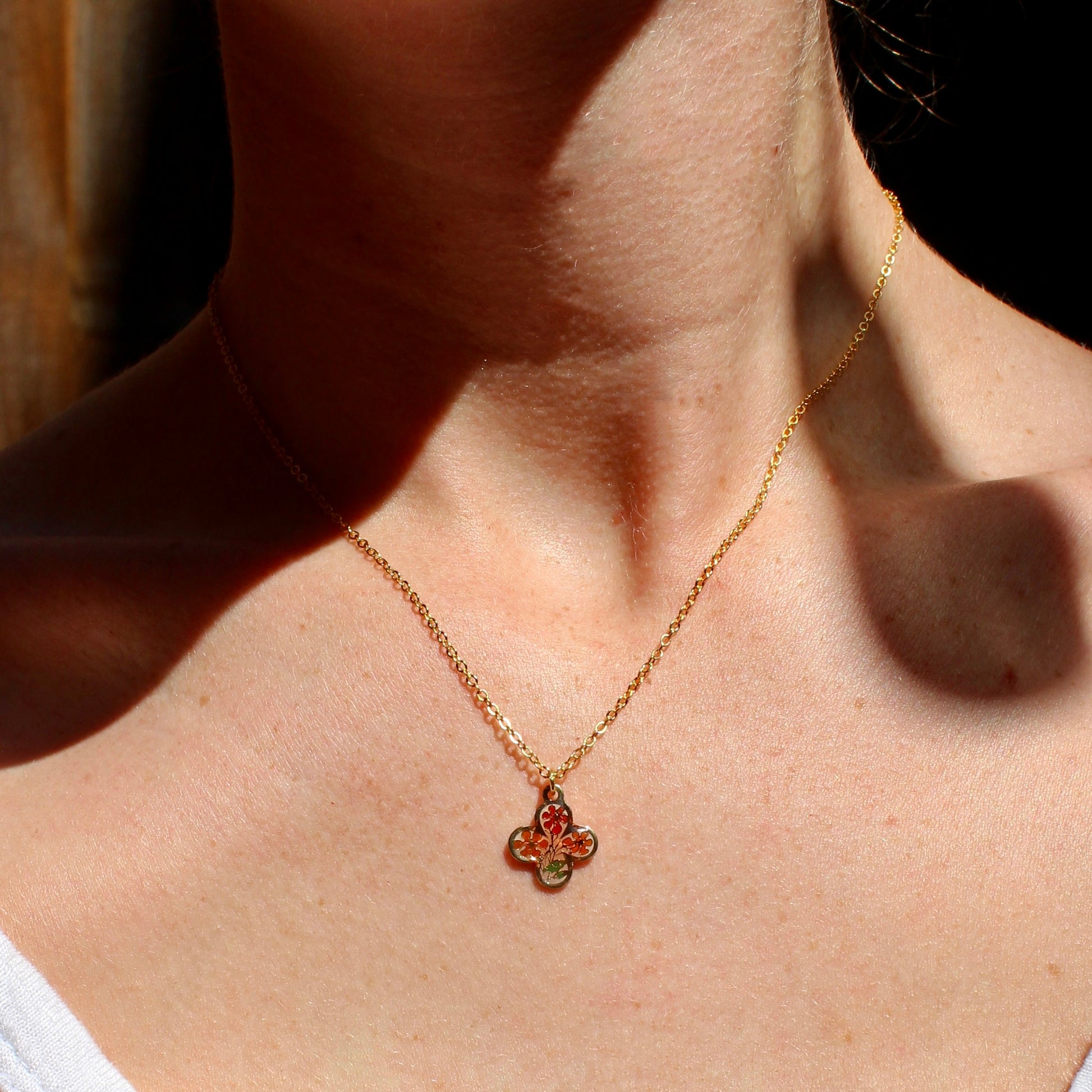 This necklace is composed of a 24k gold plated 16" long chain and features a 12mm vintage enamel floral charm pendant in the shape of a clover.