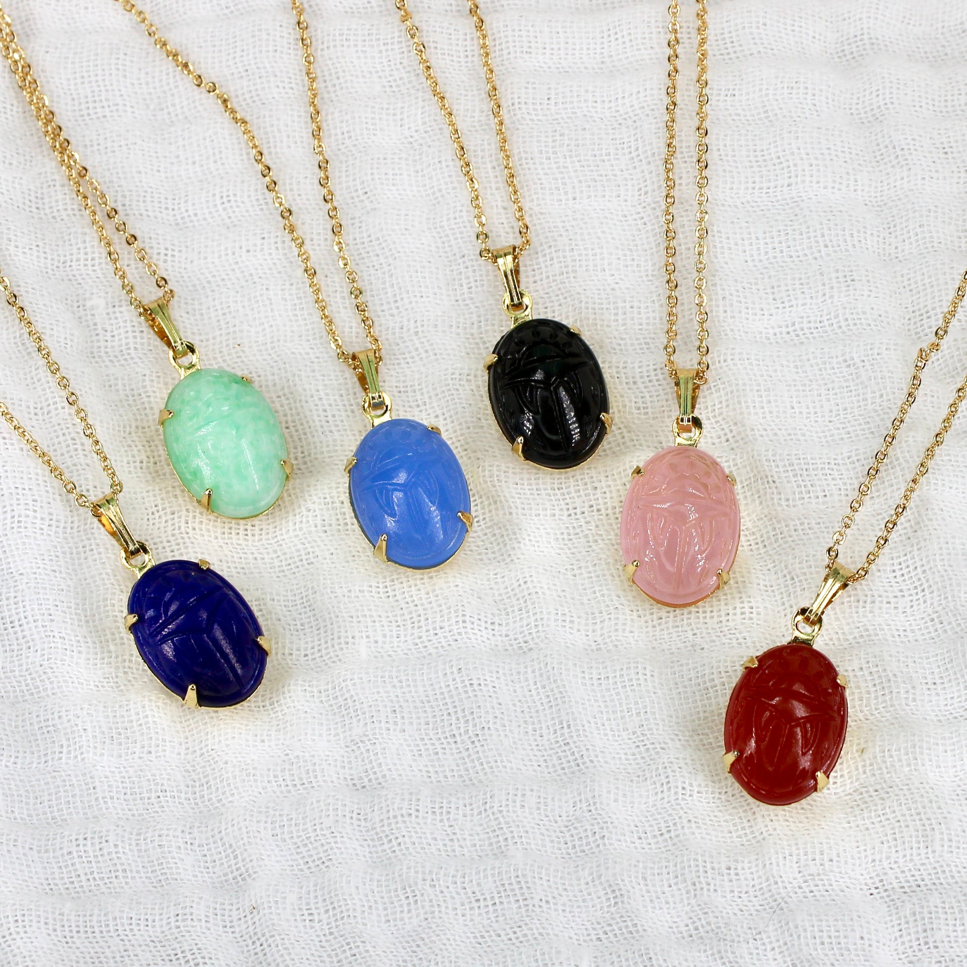 This necklace features a vintage glass scarab stone that was taken from a vintage bracelet created in the 1960s/70s for the Egyptian revival jewelry popularity period. The stone has been set in a modern gold plated setting.