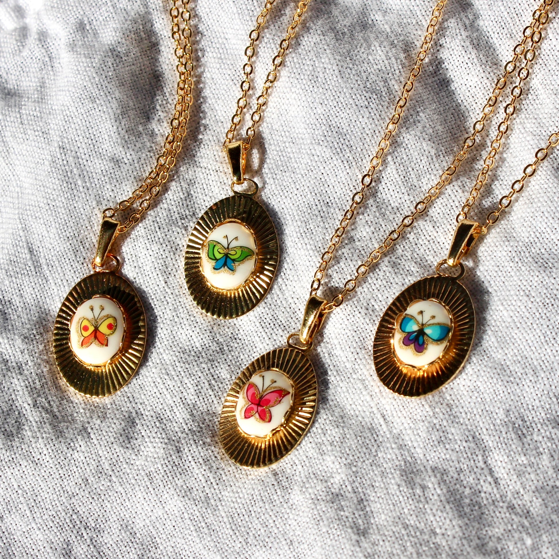 This necklace features a vintage 10x8mm Japanese glass cabochon with the motif of a butterfly set in a vintage 22x15mm gold plated setting.