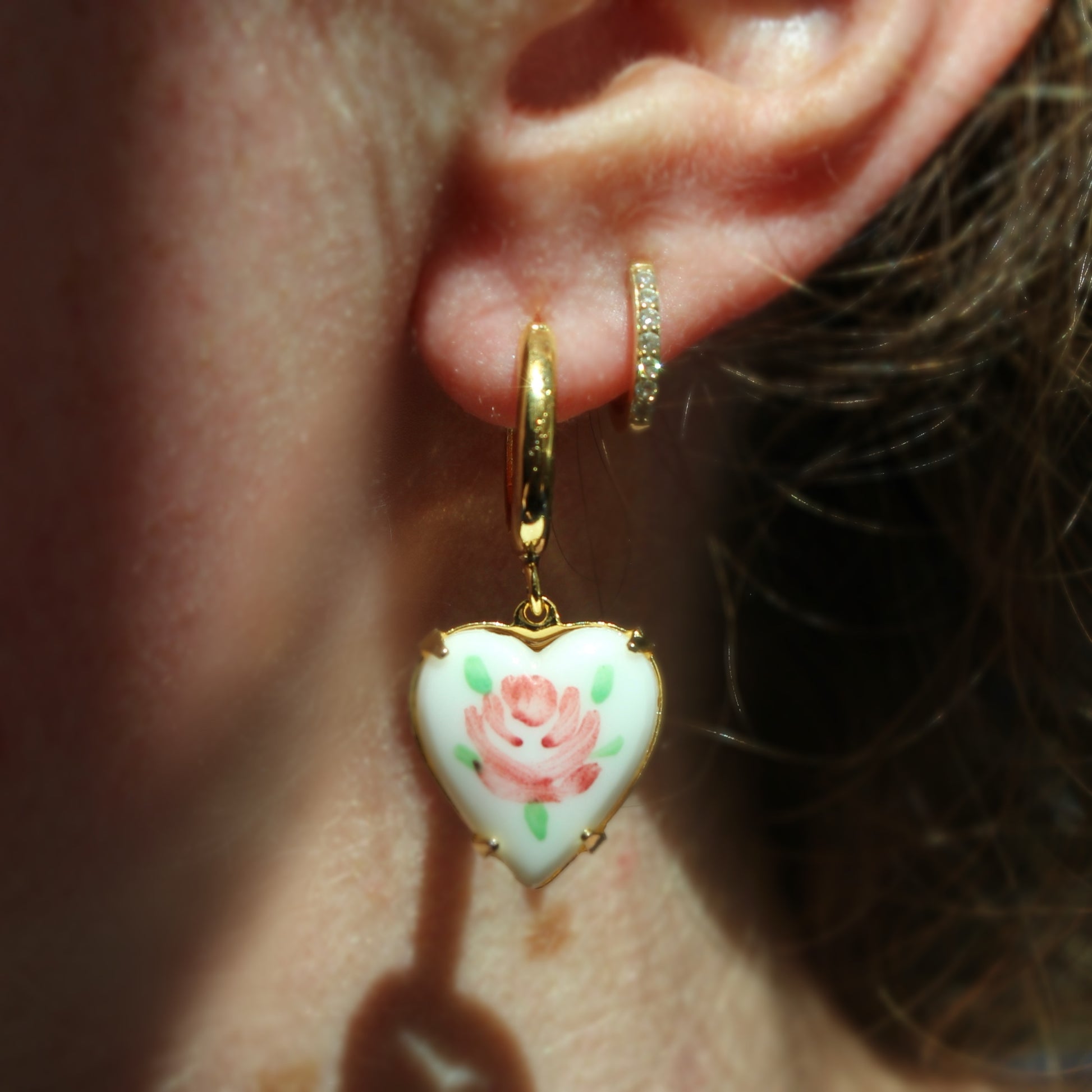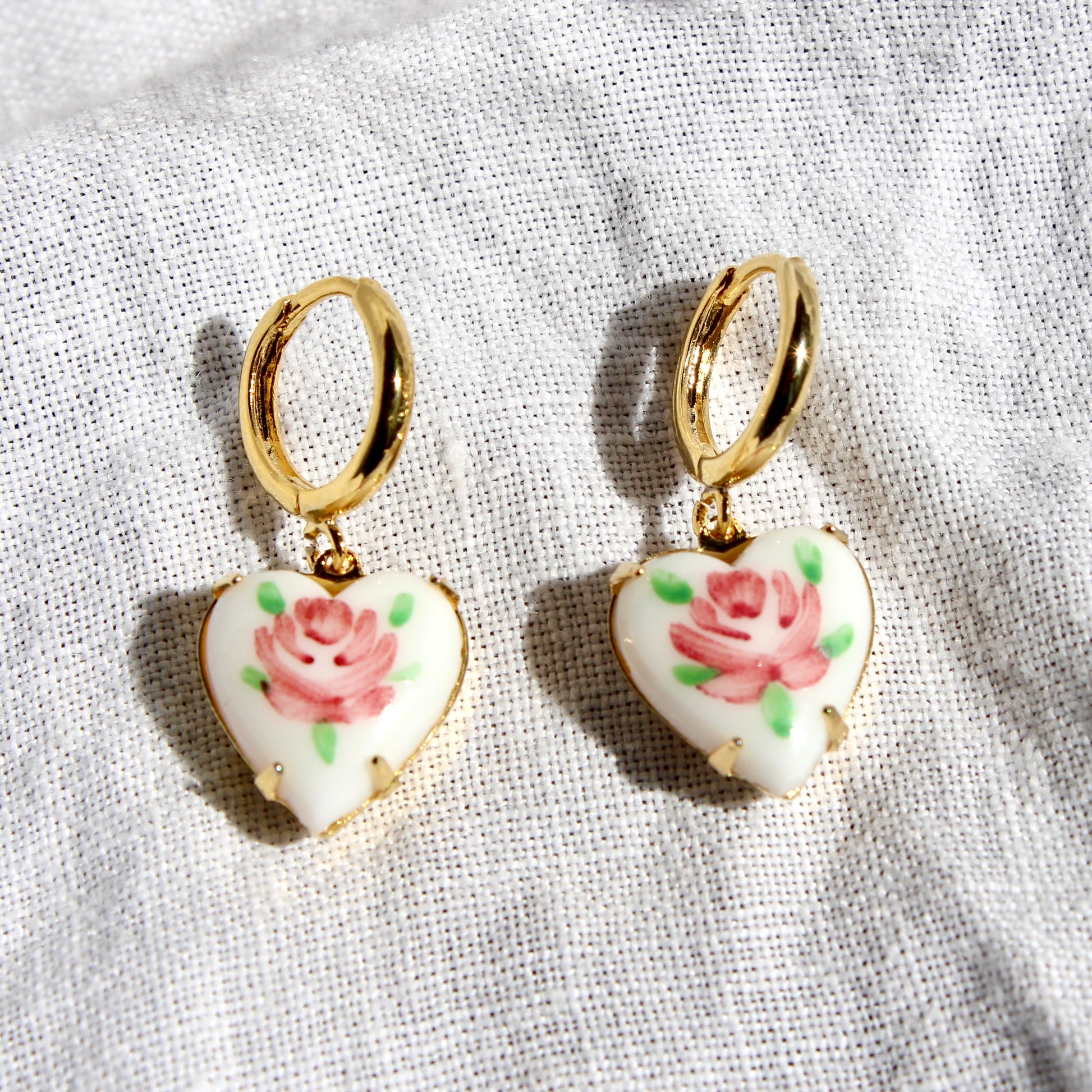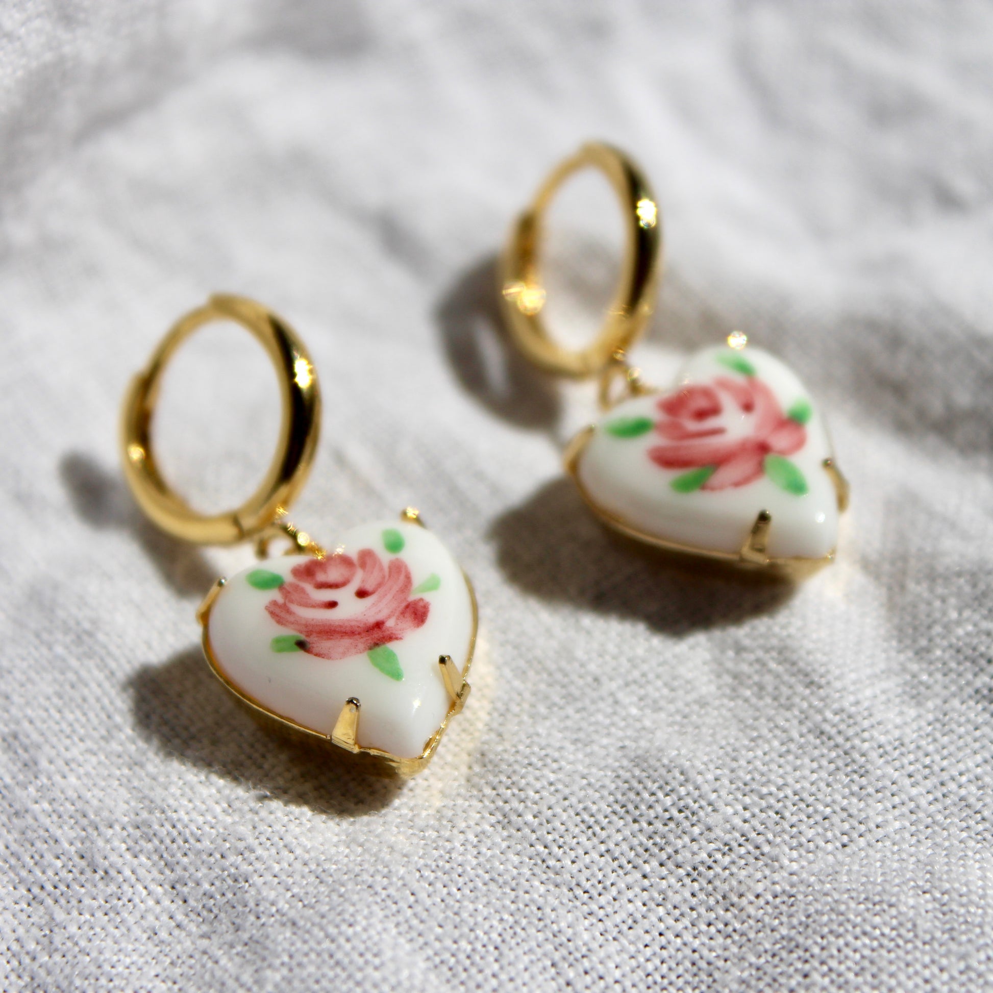 These earrings are composed of 15x14mm white glass hearts (made in Germany in the 1950s) that feature a delicate hand painted rose motif on the front.