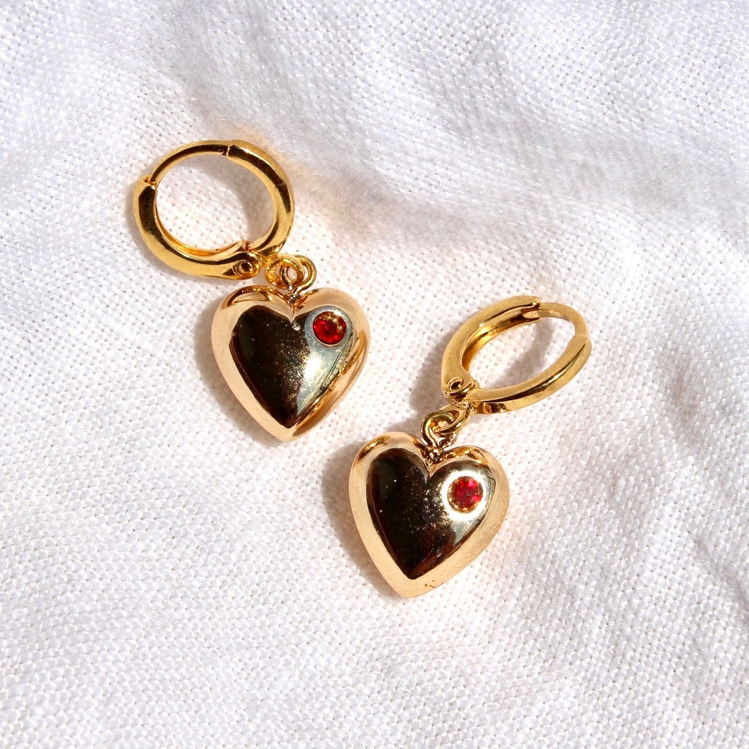 These earrings feature 12mm vintage gold-coated resin heart charms with a ruby red gemstone accent. The earrings are 24k gold plated copper and are tarnish-resistant.
