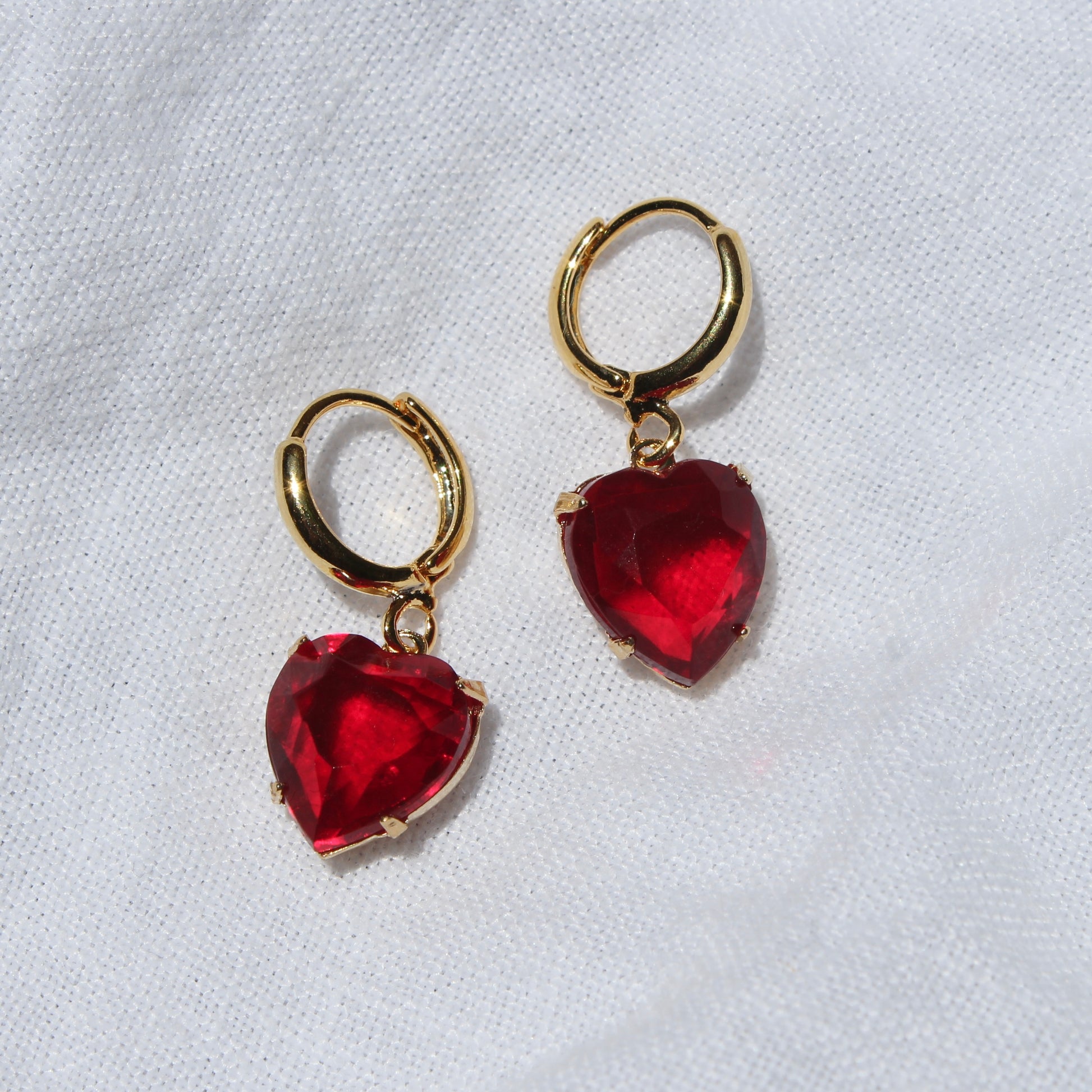 These unique earrings feature 24k gold plated 12mm hoops with a stunning vintage ruby glass heart stone attached at the base.