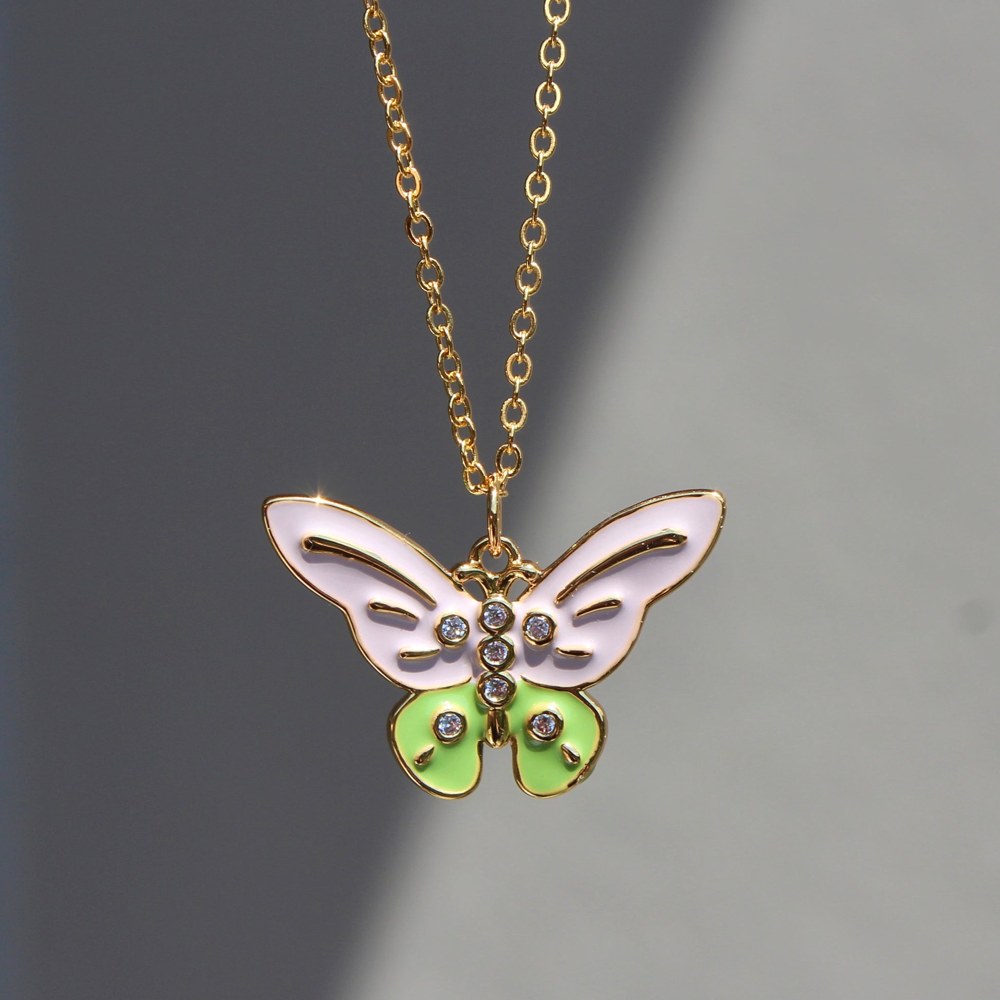 This necklace is composed of a 16" 24k gold plated chain with a colorful 27x18mm green and white enamel butterfly charm. The charm features embedded cubic zirconia stones which sparkle in the sun.