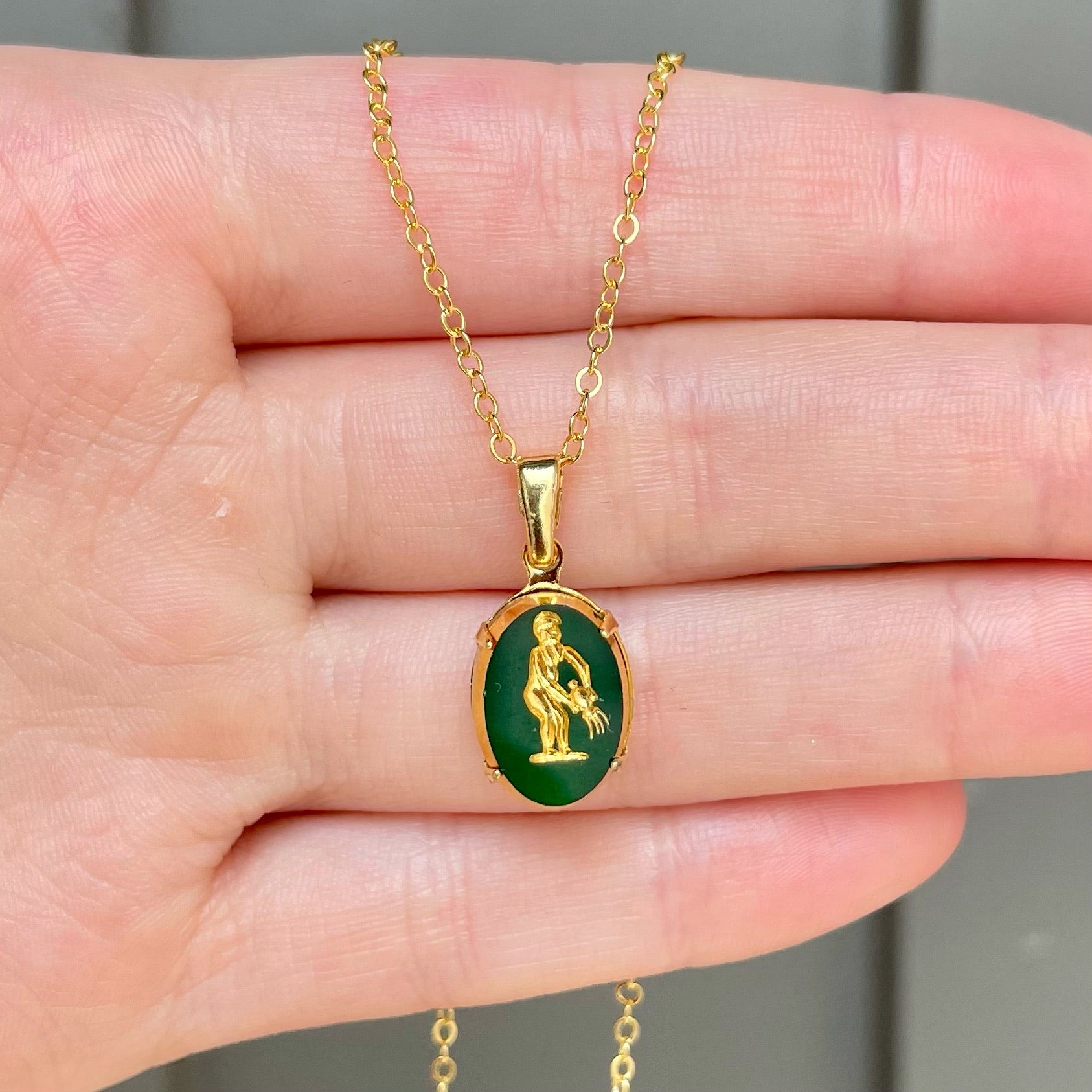 This necklace is composed of an 18k gold plated box chain with a vintage carved intaglio stone originating from western Germany and made in the 1950s.